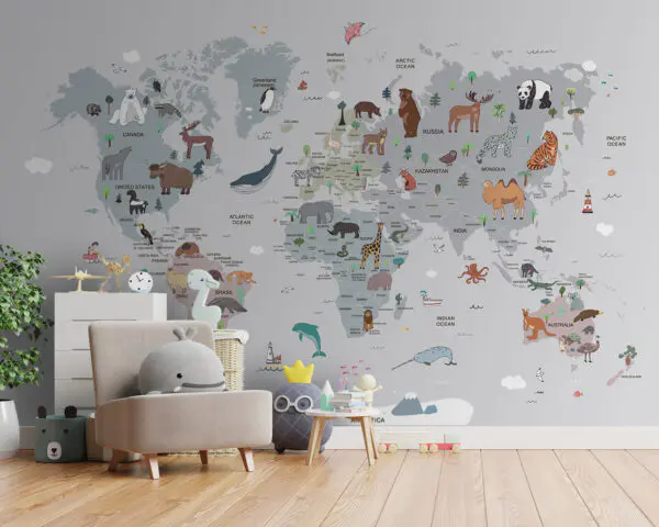Carta da parati Mappa del mondo con nuvole e animali