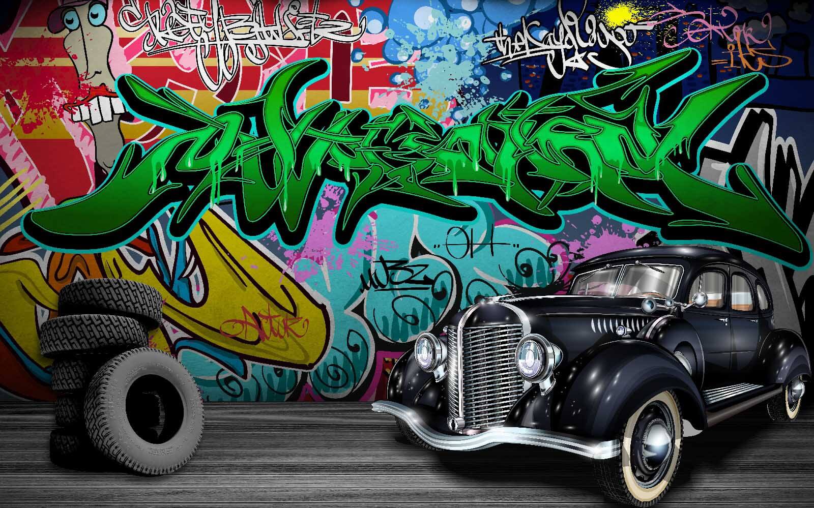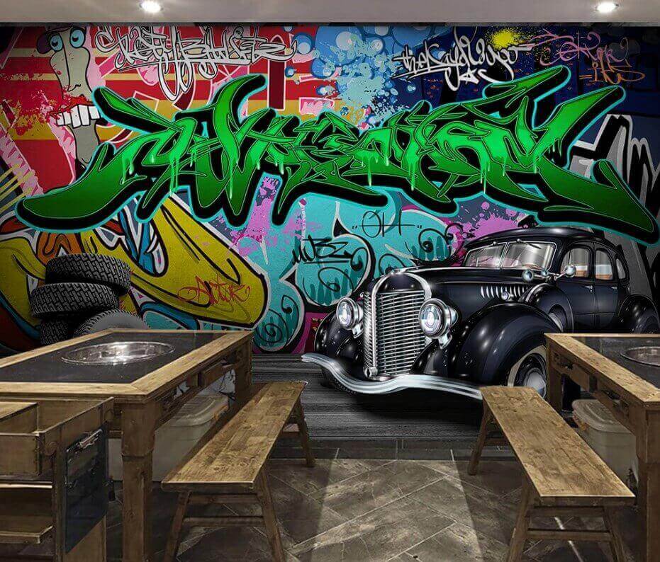 Trasforma una parete anonima in un vivace spunto di conversazione con questo suggestivo murale che raffigura una classica auto nera davanti a un tripudio di graffiti colorati. Immagina di trovarti in una stanza piena di energia: ogni sguardo rivela un nuovo dettaglio da scoprire! Il contrasto tra l’elegante veicolo e lo sfondo vivace crea una miscela perfetta di nostalgia e arte moderna.