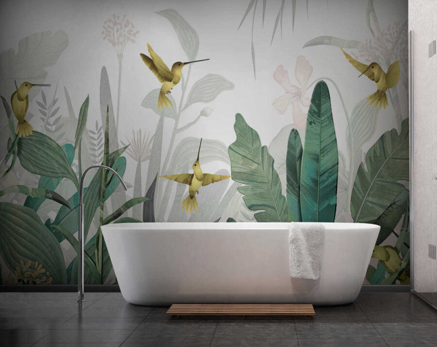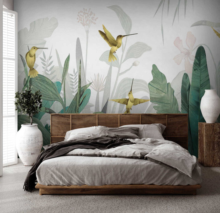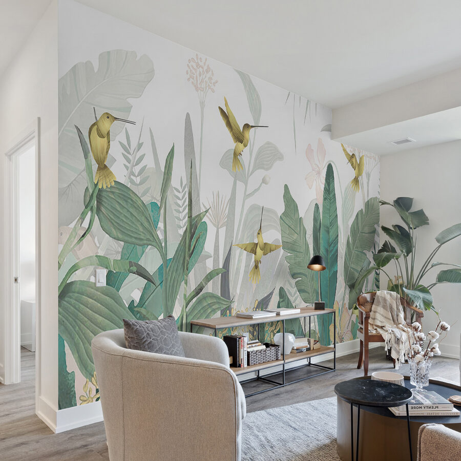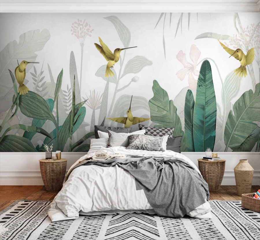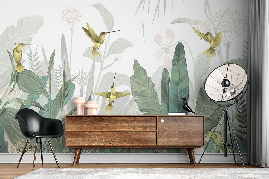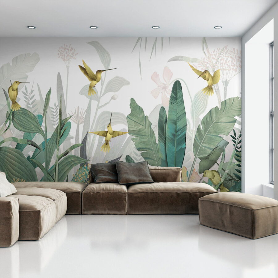 Immaginate di entrare in una stanza e di sentirvi come se foste appena entrati nel paradiso di una giungla lussureggiante: colibrì che svolazzano intorno a voi, fogliame vivace tutto intorno. Questo è l’effetto che fa il murale “Hummingbirds Flutter Amid Lush Foliage”. È come una piccola fetta di paradiso tropicale proprio sulla vostra parete!