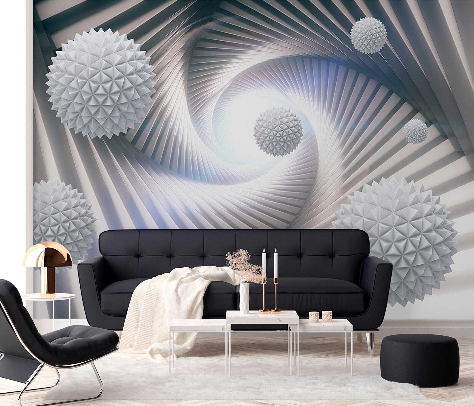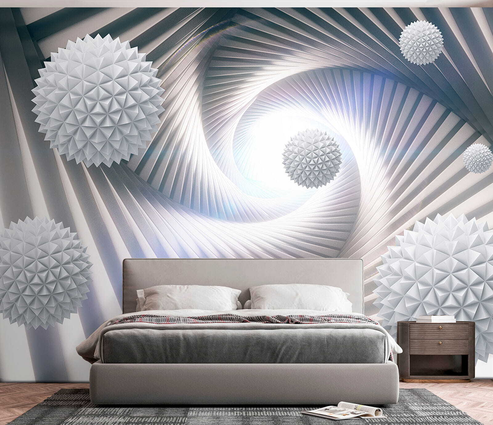 Trasformate il vostro spazio con questo accattivante murale, “Carta da parati White Sphere with Triangles”. È come entrare in un sognante paese delle meraviglie geometrico. Immaginate di entrare in una stanza e di veder spuntare dalla parete queste forme giocose e intricate. Non si tratta solo di arredamento, ma crea una vibrazione di calma e curioso calore.