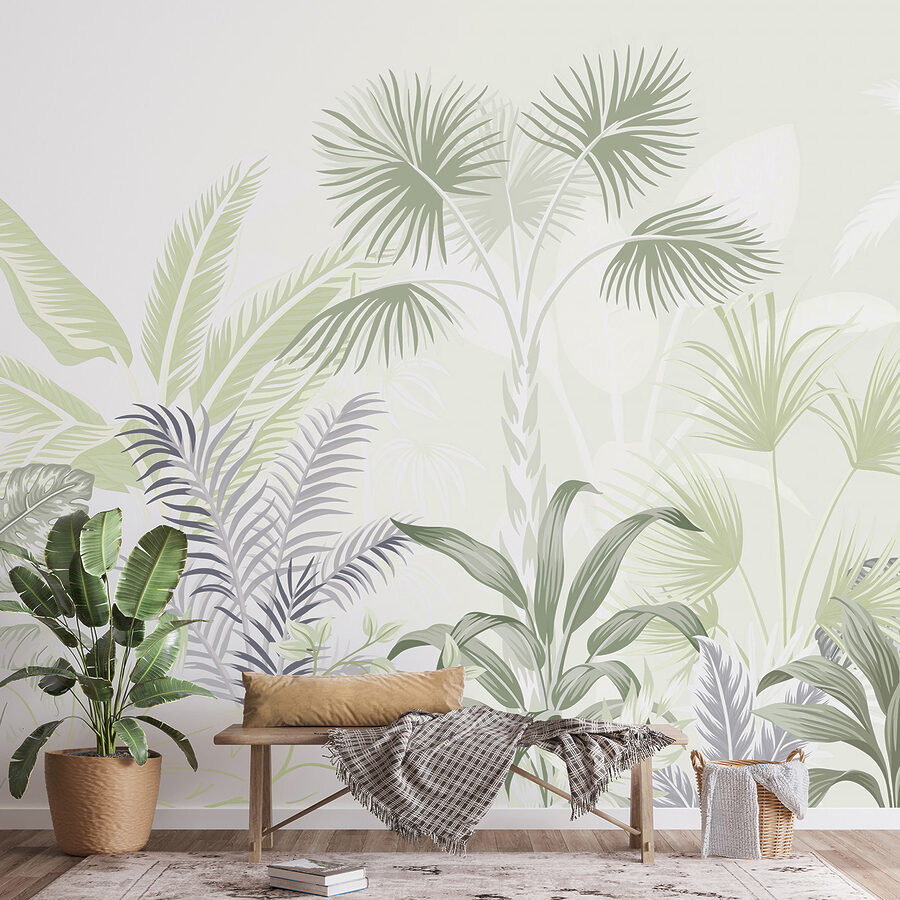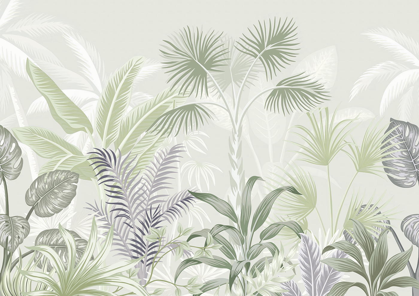 Carta da parati Illustrazione di foglie tropicali in tonalità tenui. (SKU: u06685v3)