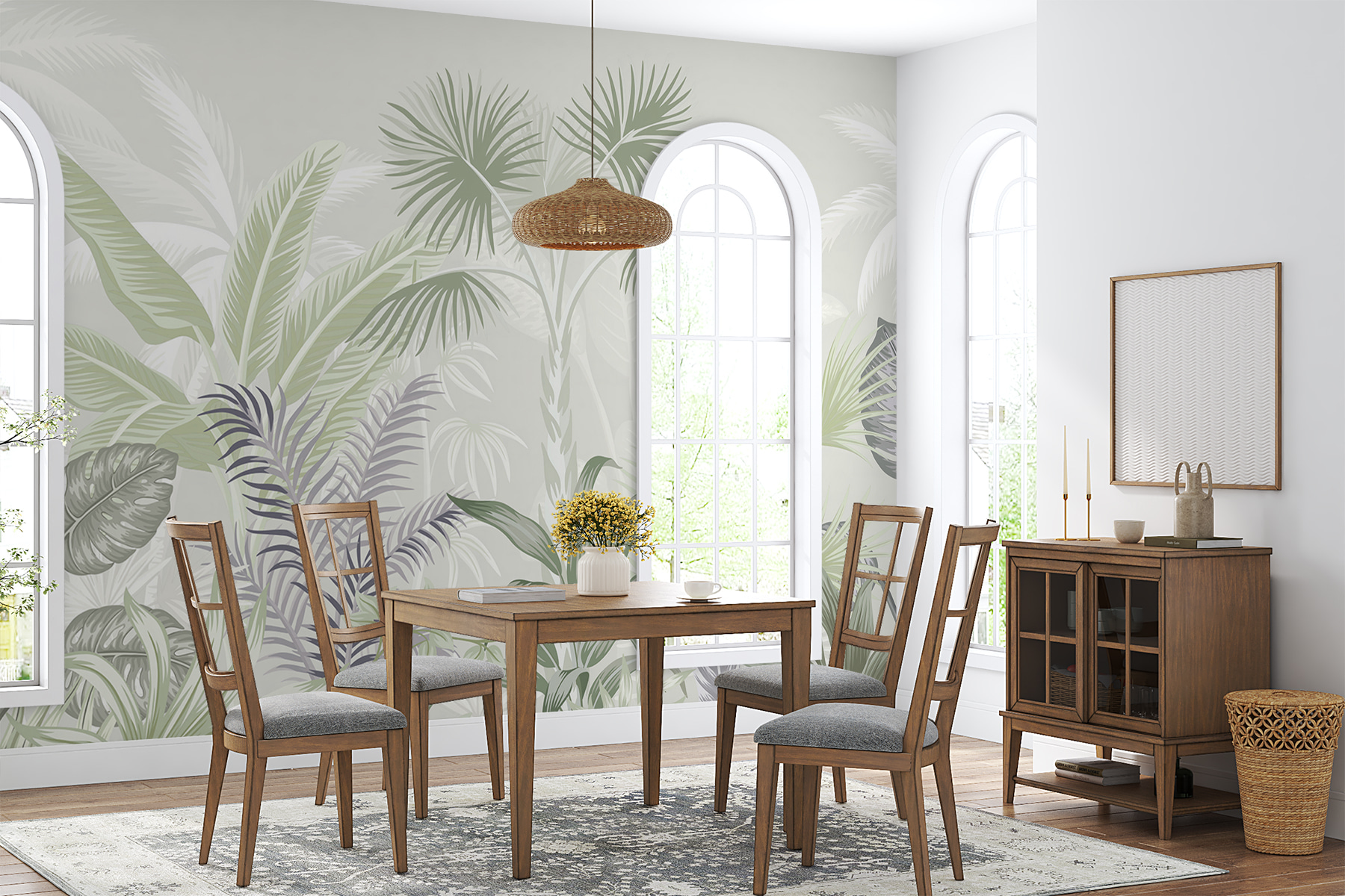 Immaginate di immergervi in una rilassante foresta pluviale ogni volta che entrate nella stanza. Questa è la magia del “Murales illustrazione di foglie tropicali in tonalità tenui”. Con i suoi verdi delicati e il fogliame lussureggiante, è come fare una mini-vacanza senza uscire di casa. Quando i vostri occhi si poseranno sulle foglie intricate, sentirete un’immediata calma. È più di una semplice decorazione: è una piccola fuga.