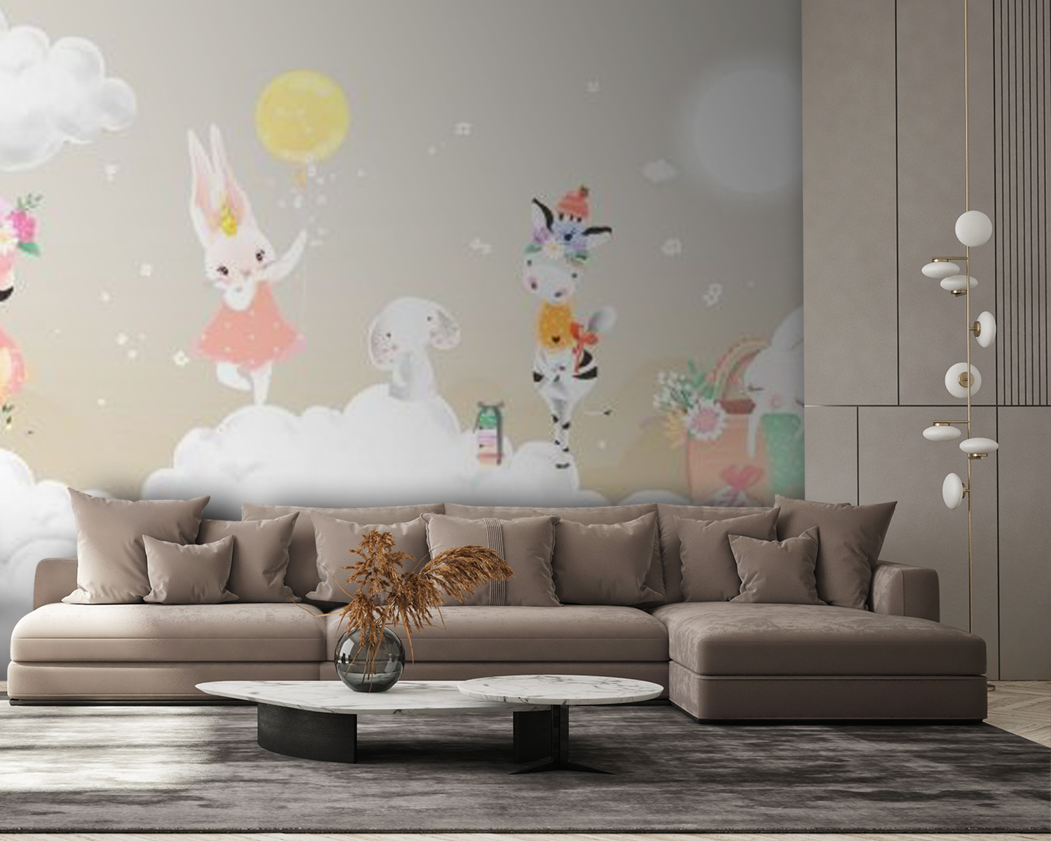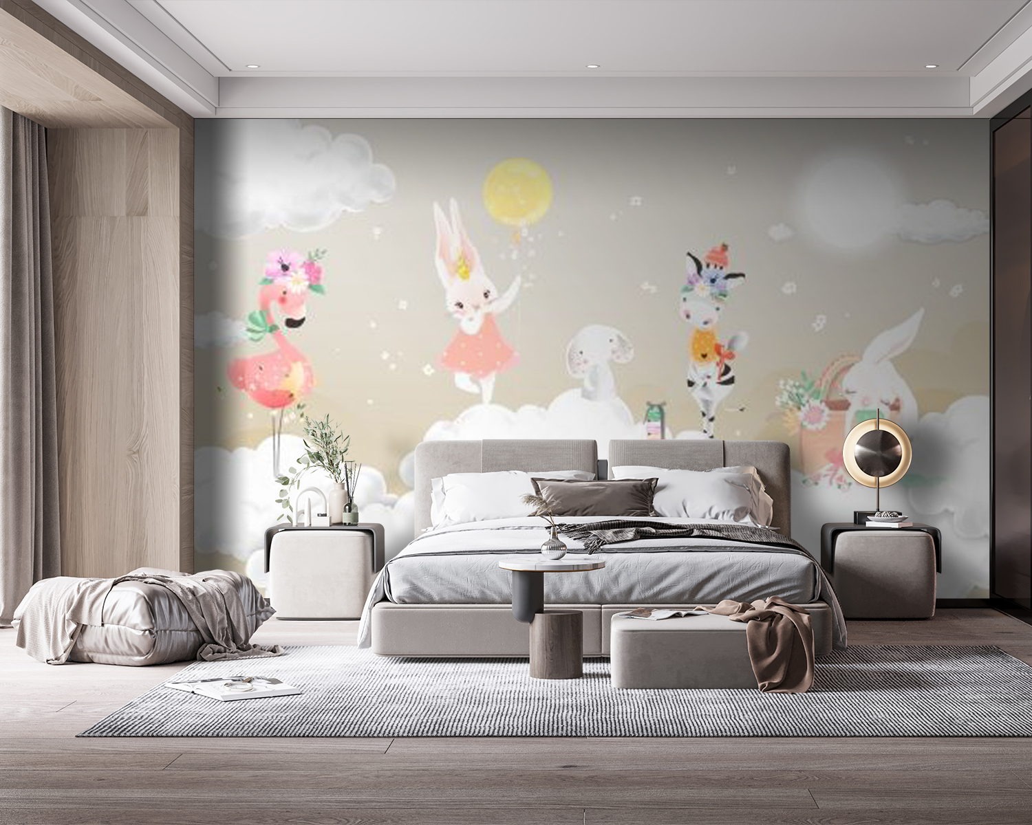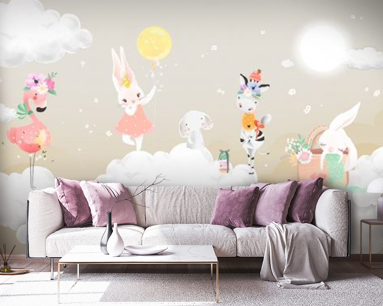 Trasformate una parete spenta in un paradiso da sogno con questo incantevole murale che raffigura uno stravagante gruppo di animali che si divertono su soffici nuvole. Immaginatevi un fenicottero giocoso, un affascinante coniglietto con un vestito rosa e una zebra che sfoggia un cappellino: se ne stanno in cielo come se fossero i padroni del posto. Questo murale trasmette un’atmosfera calda e allegra, in grado di infondere gioia in qualsiasi stanza, da una vivace cameretta a un accogliente angolo lettura. È come un abbraccio per le pareti, che avvolge gli spazi in un senso di meraviglia e immaginazione. Chi non sorriderebbe ogni volta che ci passa davanti? Perfetto per chi ama l’arredamento unico e un pizzico di magia.