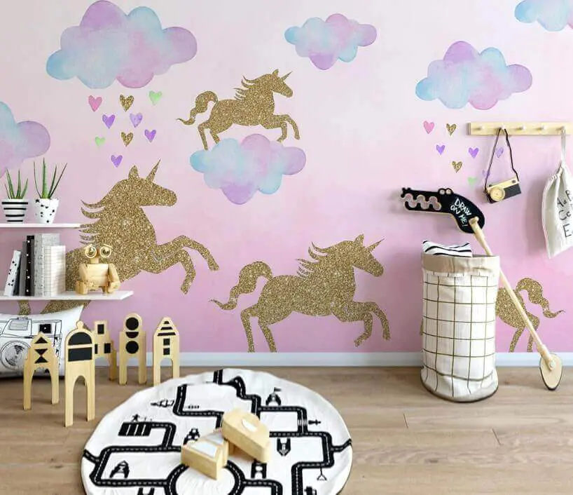Transform any room into a whimsical paradise with this enchanting wall mural. Featuring playful unicorns prancing among clouds and scattering hearts, it brings a lighthearted vibe that makes everyday life feel a bit more magical. Imagine waking up to this cheerful scene—it’s like opening your curtains to a dream! Perfect for a nursery or a creative space, it encourages imagination and joy. Plus, the sparkly unicorns add just enough sparkle to make anyone smile. Who doesn’t want a touch of fantasy, right? It’s not just decor; it’s a daily dose of delight!