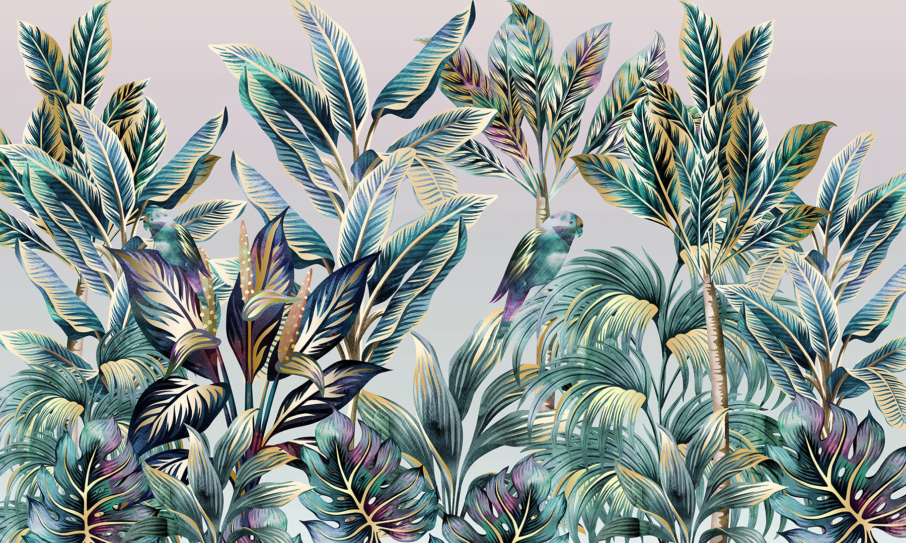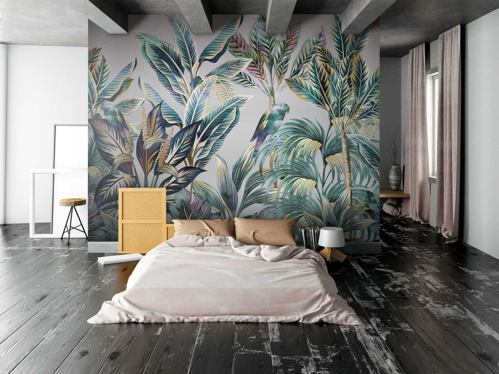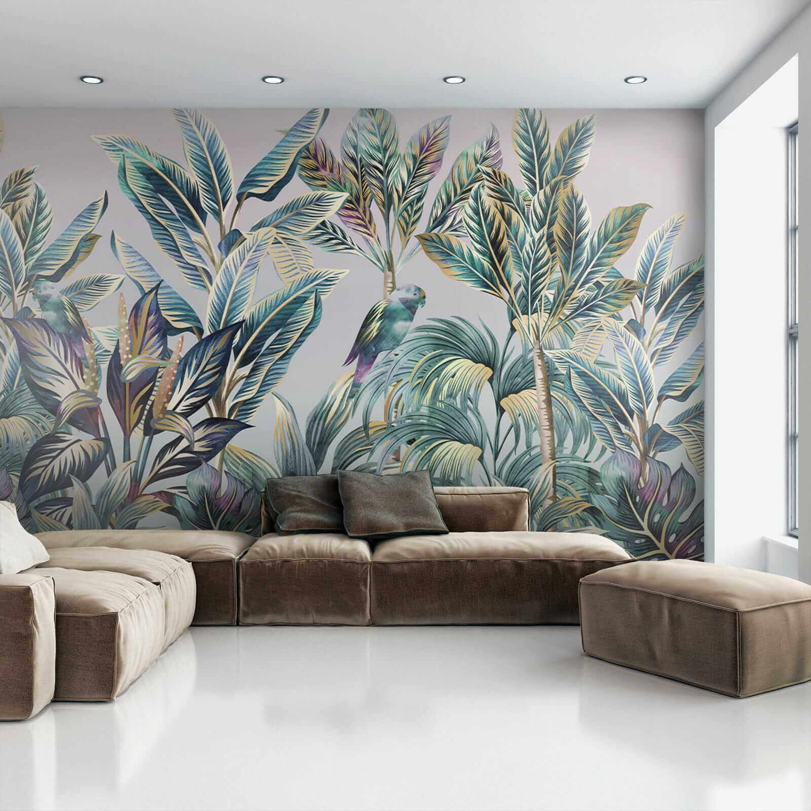 Carta da parati Fogliame tropicale con uccelli nascosti. (SKU: u09335)