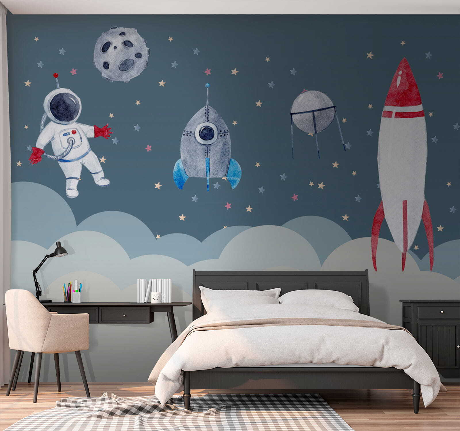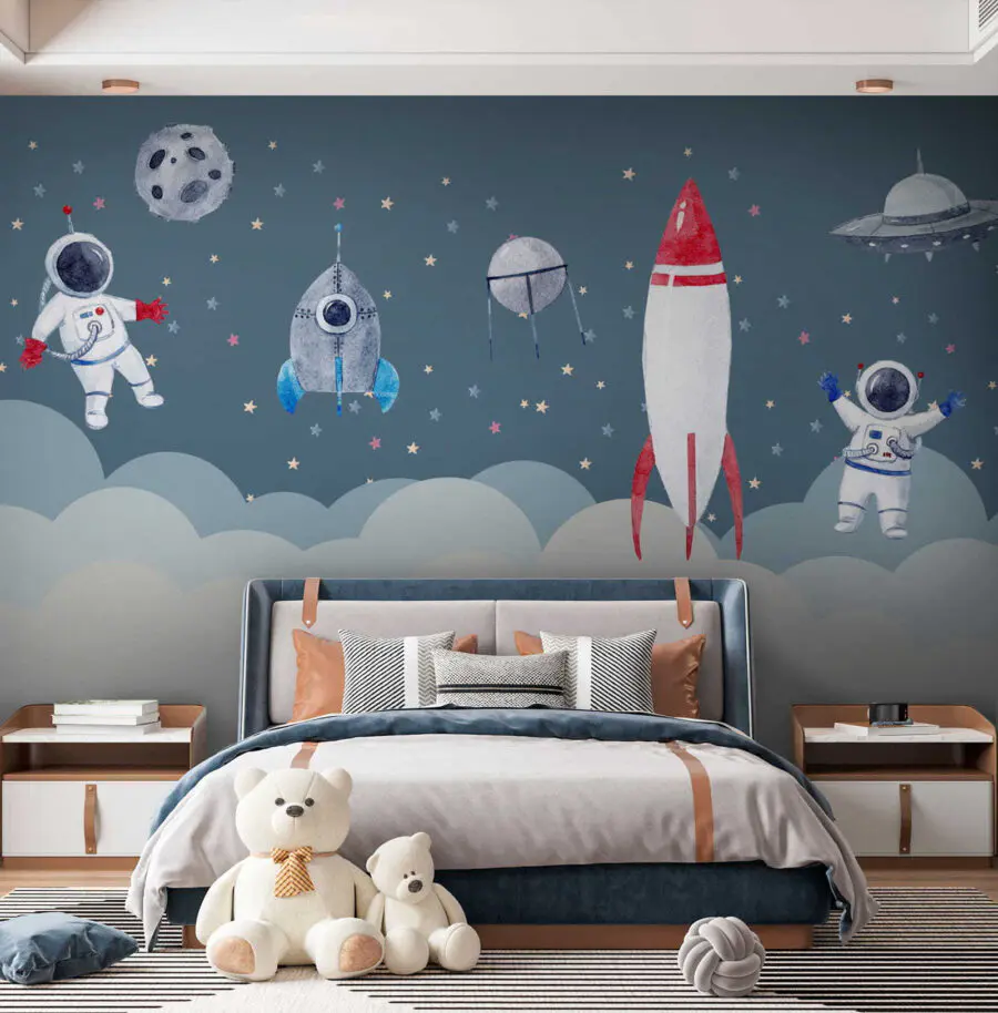 Immaginate una serata accogliente, con le luci abbassate e il vostro bambino che guarda questo stravagante murale di astronauti ad acquerello. Sembra uscito da un libro di fiabe da sogno: piccoli astronauti vivaci che fluttuano tra le stelle, rendendo magico il momento della nanna… e forse ispirando future avventure spaziali! Questo murale non è solo arte: è un biglietto per un altro mondo. Perfetto per la cameretta di ogni bambino, trasmette un’atmosfera giocosa e serena. È pieno di fascino, con le sue tinte delicate e i suoi personaggi allegri, che trasformano qualsiasi parete in una tela dell’immaginazione. Sarà impossibile non sorridere ogni volta che lo vedrete!