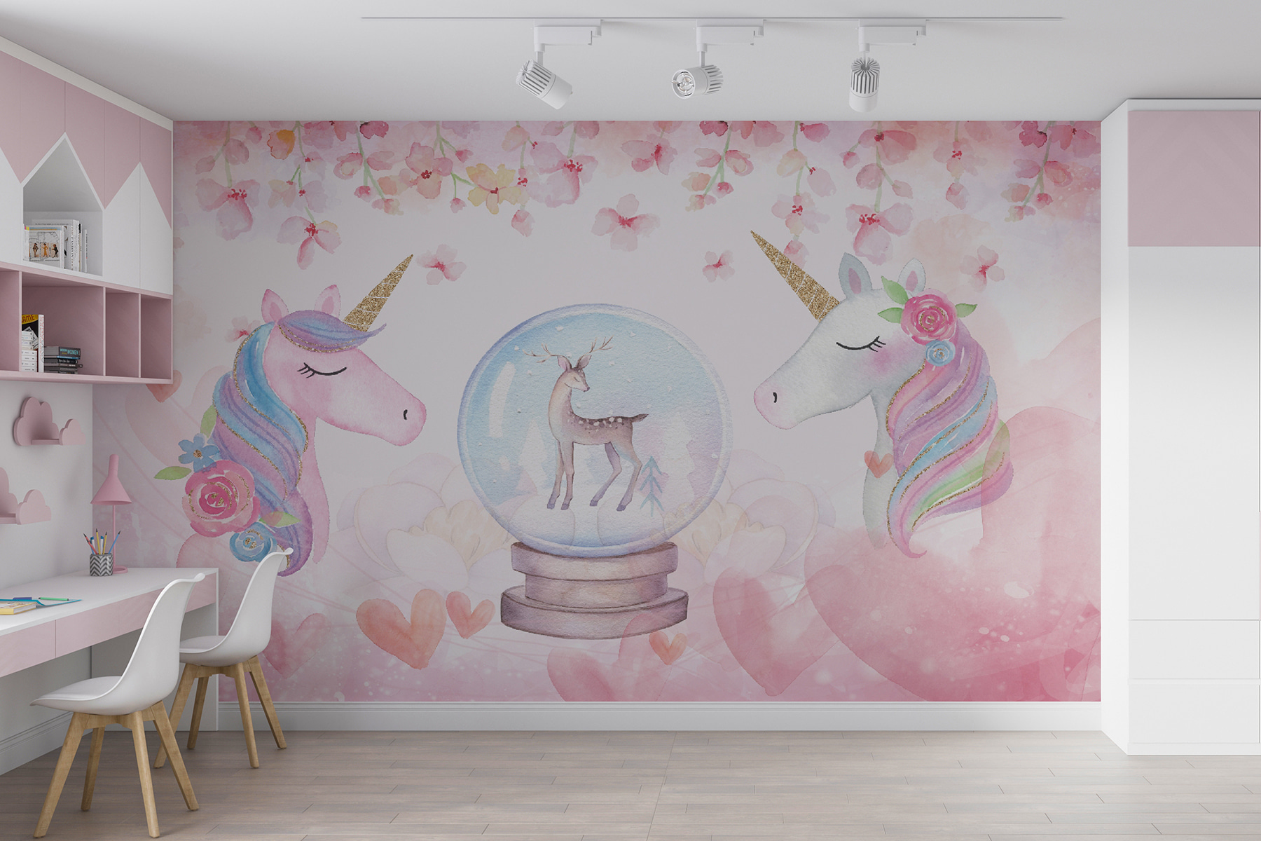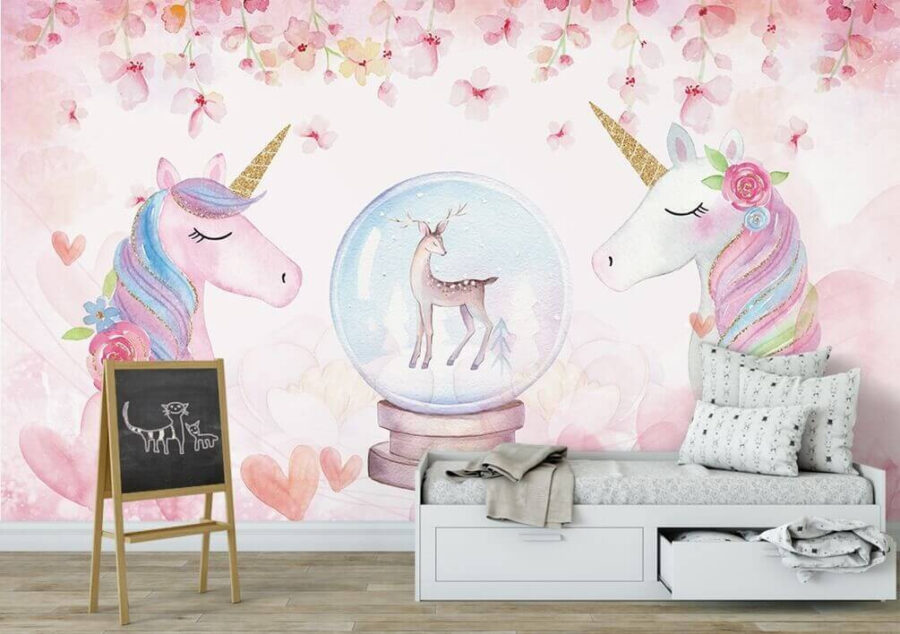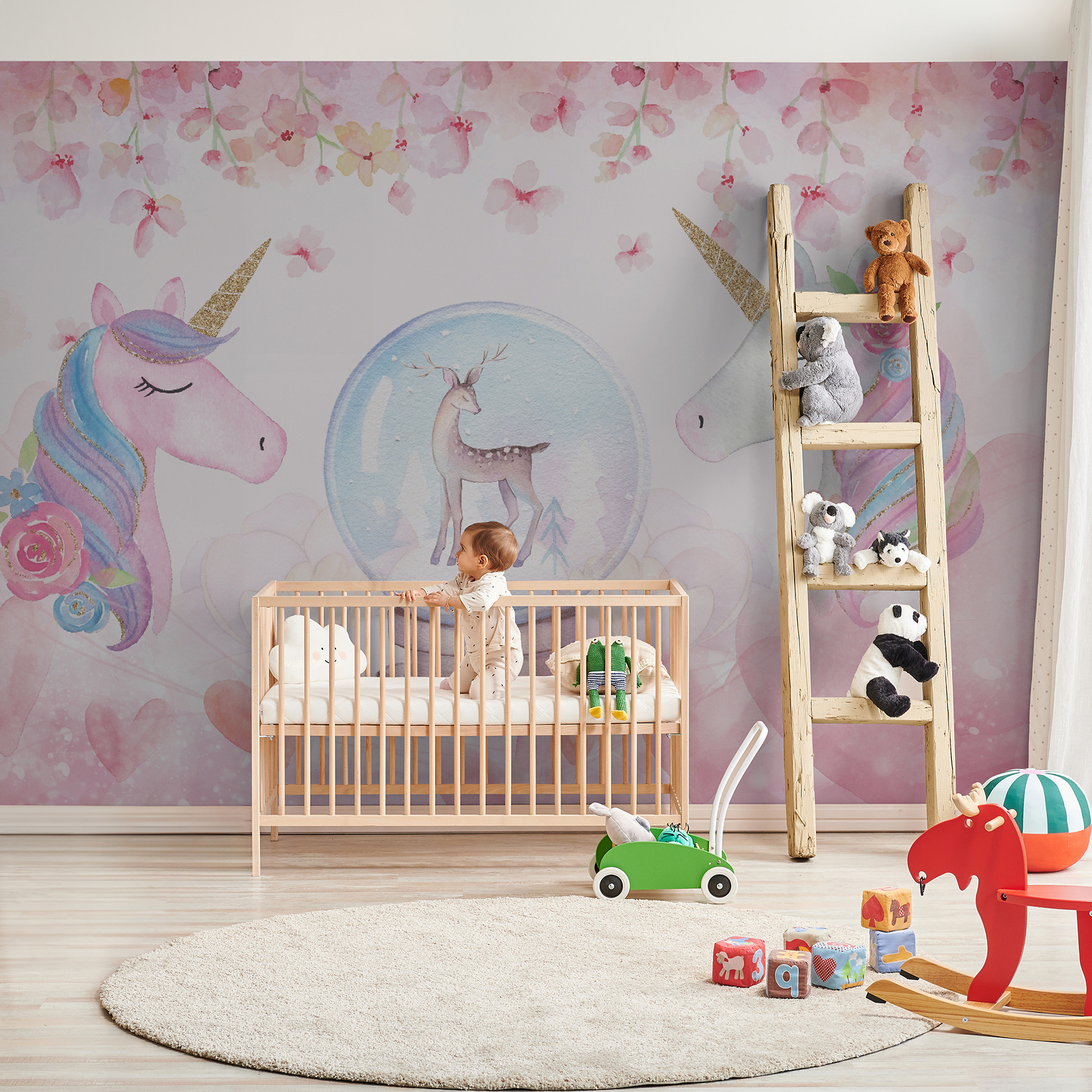 Caratterizzato da dolci unicorni in mezzo a tenui tonalità floreali rosa e da uno splendido cervo in una palla di neve, questo murale sembra uscito direttamente da una fiaba. Le morbide tonalità dell’acquerello sono rassicuranti, mentre i dettagli giocosi ispirano immaginazione e fantasia.