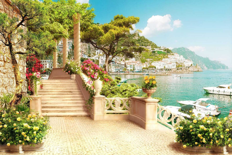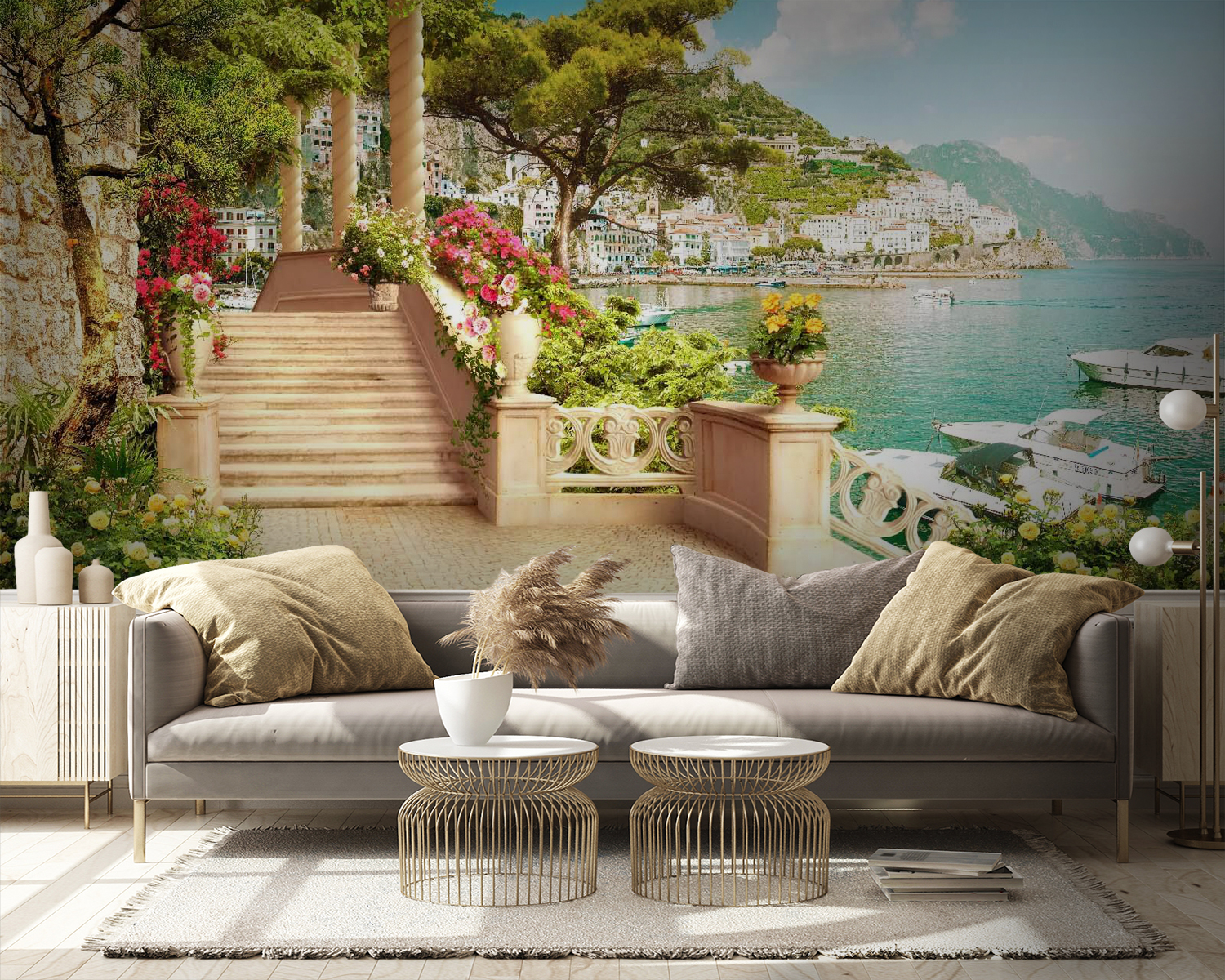 Immaginate di entrare in un’atmosfera serena ogni volta che guardate questo murale. Con i suoi colori delicati e la vista mozzafiato sulla costa, è come avere una deliziosa terrazza in casa. Immaginate di sorseggiare qui il caffè del mattino, il sole che fa capolino tra gli alberi e il suono delle onde che sussurrano segreti. I fiori aggiungono quel tocco di vita perfetto che invita a un sorriso caldo come il sole. Gli amici potrebbero persino chiedervi se siete andati in vacanza, ma la parte migliore? Non è necessario fare le valigie! Questo murale trasforma senza sforzo il vostro spazio, portando l’atmosfera da sogno direttamente sulle vostre pareti. Cosa c’è da non amare?