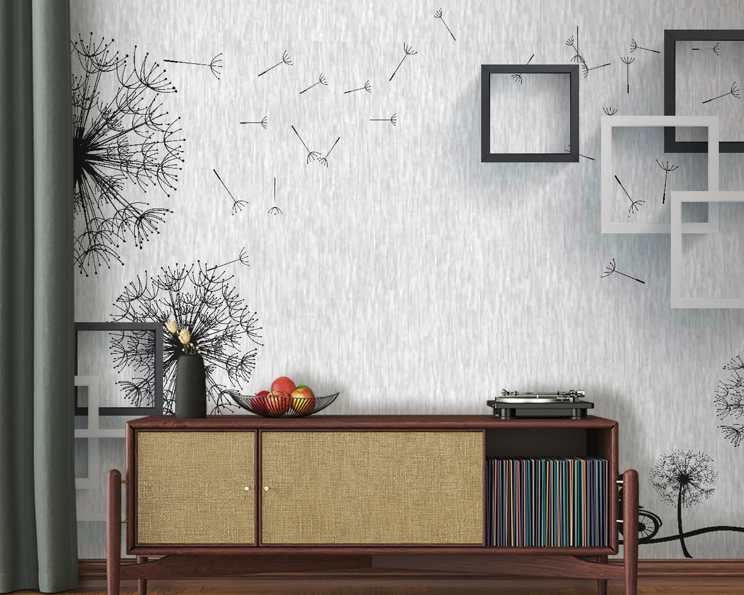 Immagina di entrare in una stanza e di essere accolto da una scena stravagante in cui una coppia pedala felicemente in bicicletta, circondata da soffioni da sogno. Questo murale non è solo un elemento decorativo, ma un sogno ad occhi aperti che si riflette sulla tua parete, rendendo immediatamente più vivace qualsiasi spazio. Il delicato contrasto tra il bianco e il nero crea un’atmosfera serena, perfetta per rilassarsi dopo una lunga giornata. È come sedersi in un parco, sentire la brezza mentre si guardano i semi di dente di leone che volano via. Perfetto per un angolo accogliente o una stanza giocosa per bambini, questo murale invita a raccontare storie e a ridere. Chi non ama un po’ di avventura a casa propria?