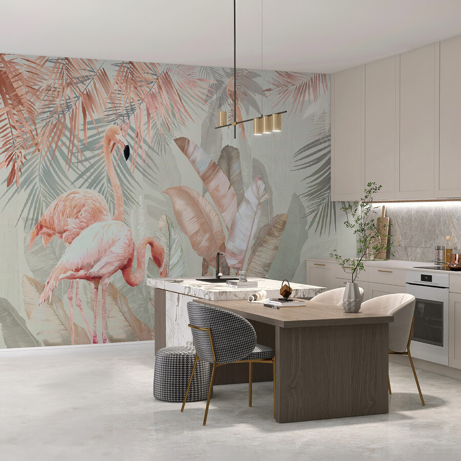 Perfetto per aggiungere un tocco di natura a qualsiasi spazio, che sia il soggiorno, la camera da letto o anche un accogliente angolo lettura. I colori sono così rassicuranti, ma allo stesso tempo vivaci quanto basta per creare un effetto visivo di grande impatto. E quei fenicotteri? Sono troppo affascinanti con la loro postura serena e le loro delicate piume rosa. Questo murale non si limita a decorare, ma trasforma. Improvvisamente, la parete banale diventa una tela con la bellezza della natura, viva e invitante.