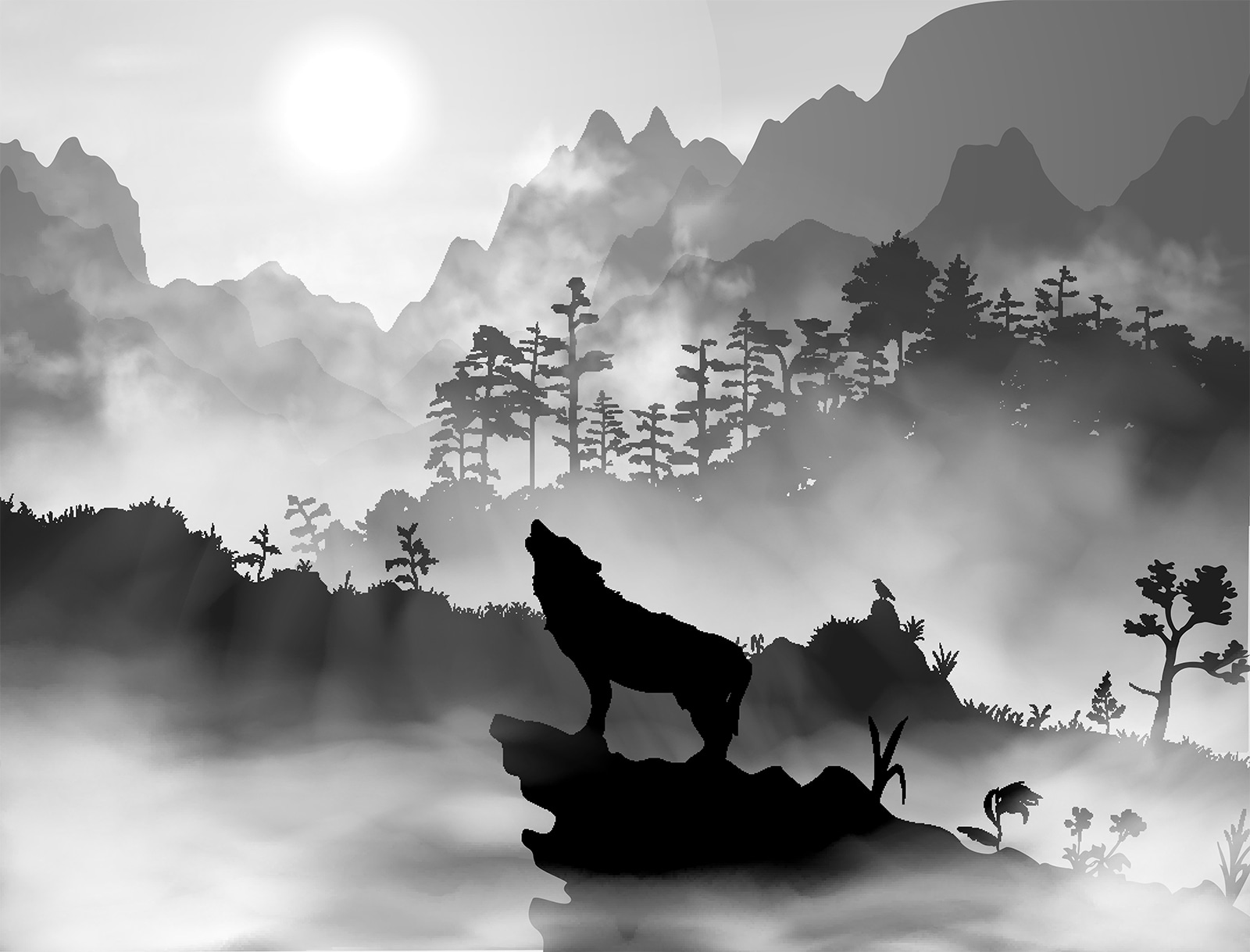 Imagine stepping into a cozy room where a stunning mural of a wolf howling at the moon takes center stage. This isn’t just any mural; it’s like nature’s poetry on your wall. The soft, misty mountains and silhouetted trees create a serene backdrop, coaxing those wandering thoughts into a peaceful mind.