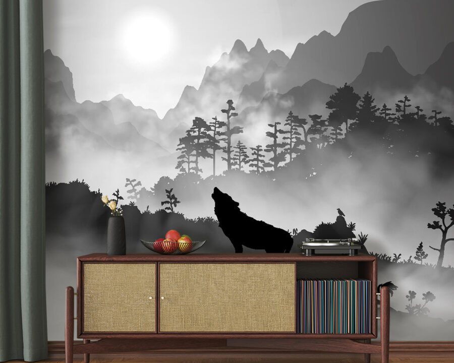 Immaginate di entrare in una stanza accogliente dove spicca uno splendido murale raffigurante un lupo che ulula alla luna. Non è un murale qualsiasi, è come una poesia della natura sulla vostra parete. Le montagne morbide e nebbiose e gli alberi silhouette creano uno sfondo sereno, che induce i pensieri vaganti a una mente tranquilla.