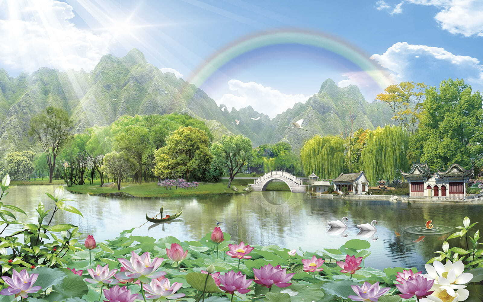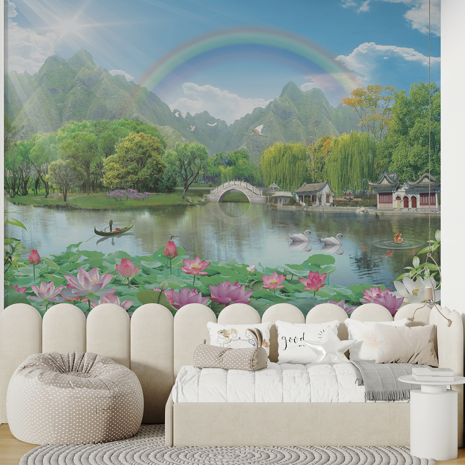 Immaginate di entrare in una stanza e di essere trasportati in un sereno paradiso lacustre… Riuscite a sentirlo? È esattamente quello che fa questo murale. “Paesaggio sereno con fiori di loto” è come un dolce sospiro per la vostra anima, calmante e tranquilla. Perfetto per le camerette o per qualsiasi spazio che necessiti di un tocco di pace. Immaginate di rilassarvi dopo una giornata frenetica, crogiolandovi nella morbida luce del sole al tramonto, con l’aria piena del dolce profumo dei fiori di loto… Vi sentirete in vacanza ogni giorno! In più, è un simpatico spunto di conversazione per gli ospiti (o un perfetto sfondo per Instagram). Che si tratti di decorare la stanza di un bambino o di aggiungere un tocco di natura al vostro spazio vitale, questo murale vi farà sicuramente sorridere ogni volta che lo vedrete.