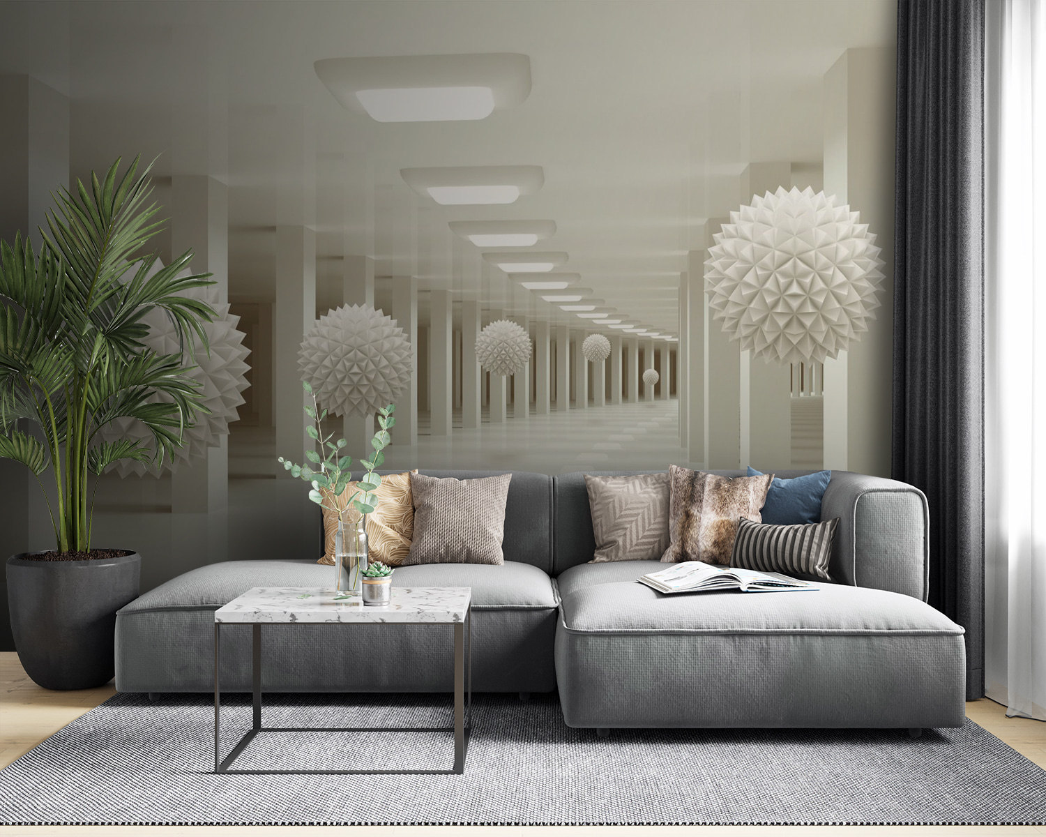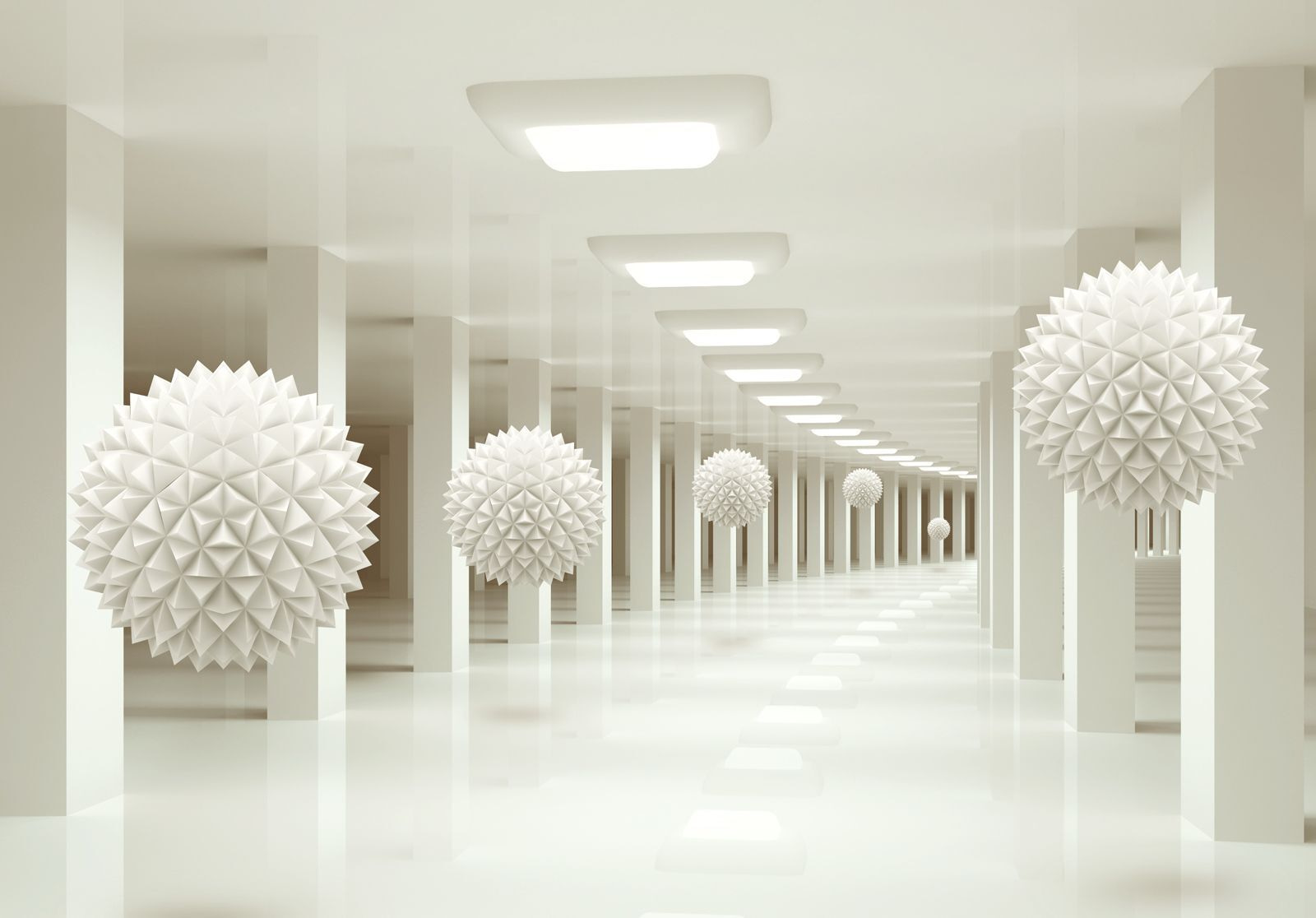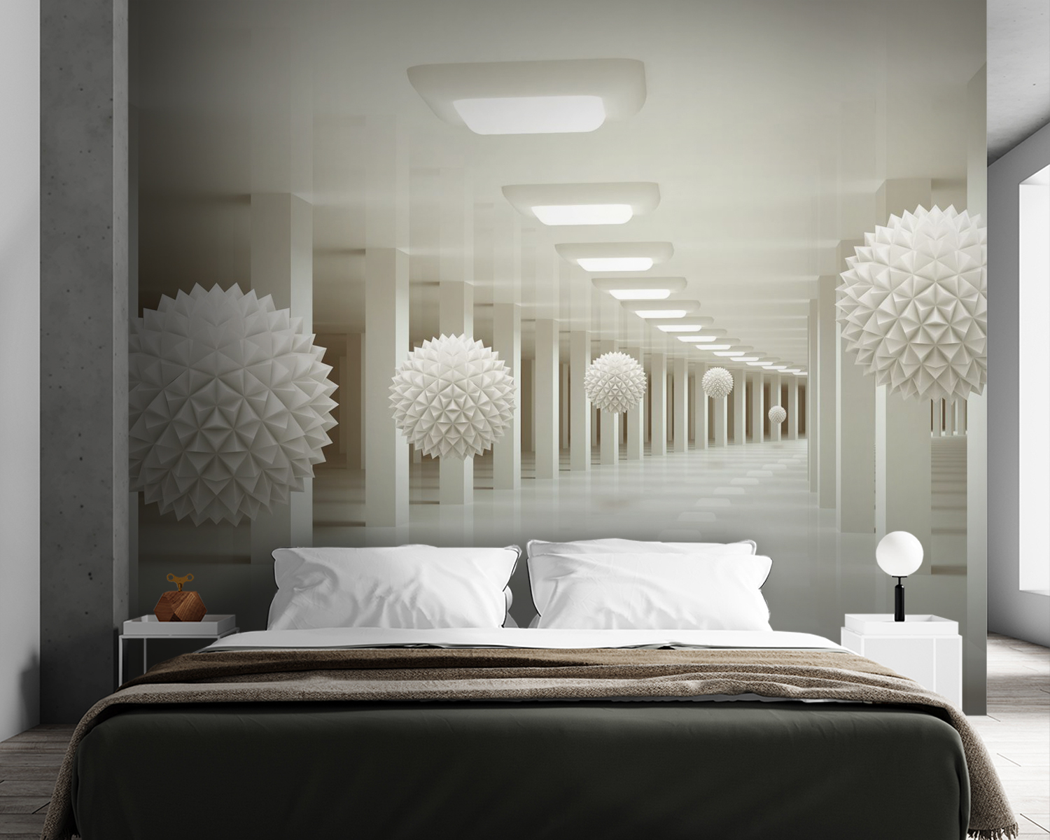 Avete mai desiderato sentirvi in una galleria d’arte futuristica? Il “Carta da parati White Sphere with Triangles” vi dà esattamente questa sensazione! Immaginatelo nel vostro accogliente salotto o in un elegante ufficio: una sfilata di sfere bianche in 3D che fluttuano serenamente in un paese delle meraviglie geometrico. È come entrare in un’altra dimensione!