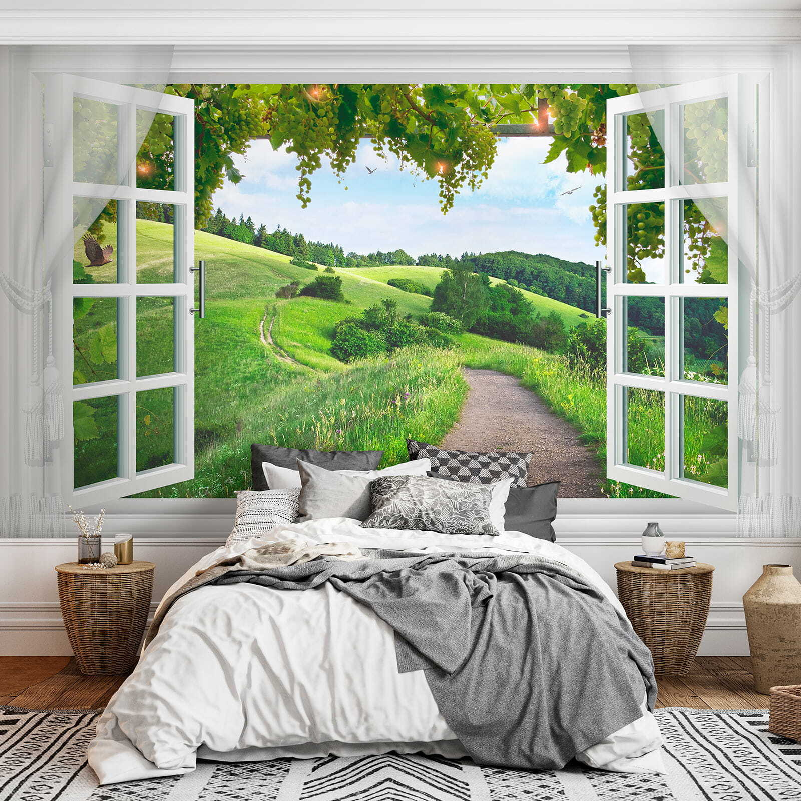 Avete mai sognato di avere una vista mozzafiato senza uscire di casa? Questo murale “Uccello che vola attraverso una finestra” potrebbe essere la risposta! Immaginate di svegliarvi con colline verdeggianti e un sentiero che conduce a chissà dove… È come avere la propria fetta di serenità di campagna proprio nel salotto di casa. La parte migliore? Non sono necessarie finestre. Si possono ottenere tutte le vibrazioni della natura senza il freddo del vento. Davvero, ogni sguardo a questo murale sembra un mini-paesaggio, mentre l’uccello sembra scivolare senza sforzo attraverso la finestra aperta. Perfetto per quei giorni in cui si desidera rilassarsi e lasciar vagare la mente. Date un tocco di magia al vostro spazio e lasciate volare la vostra immaginazione.
