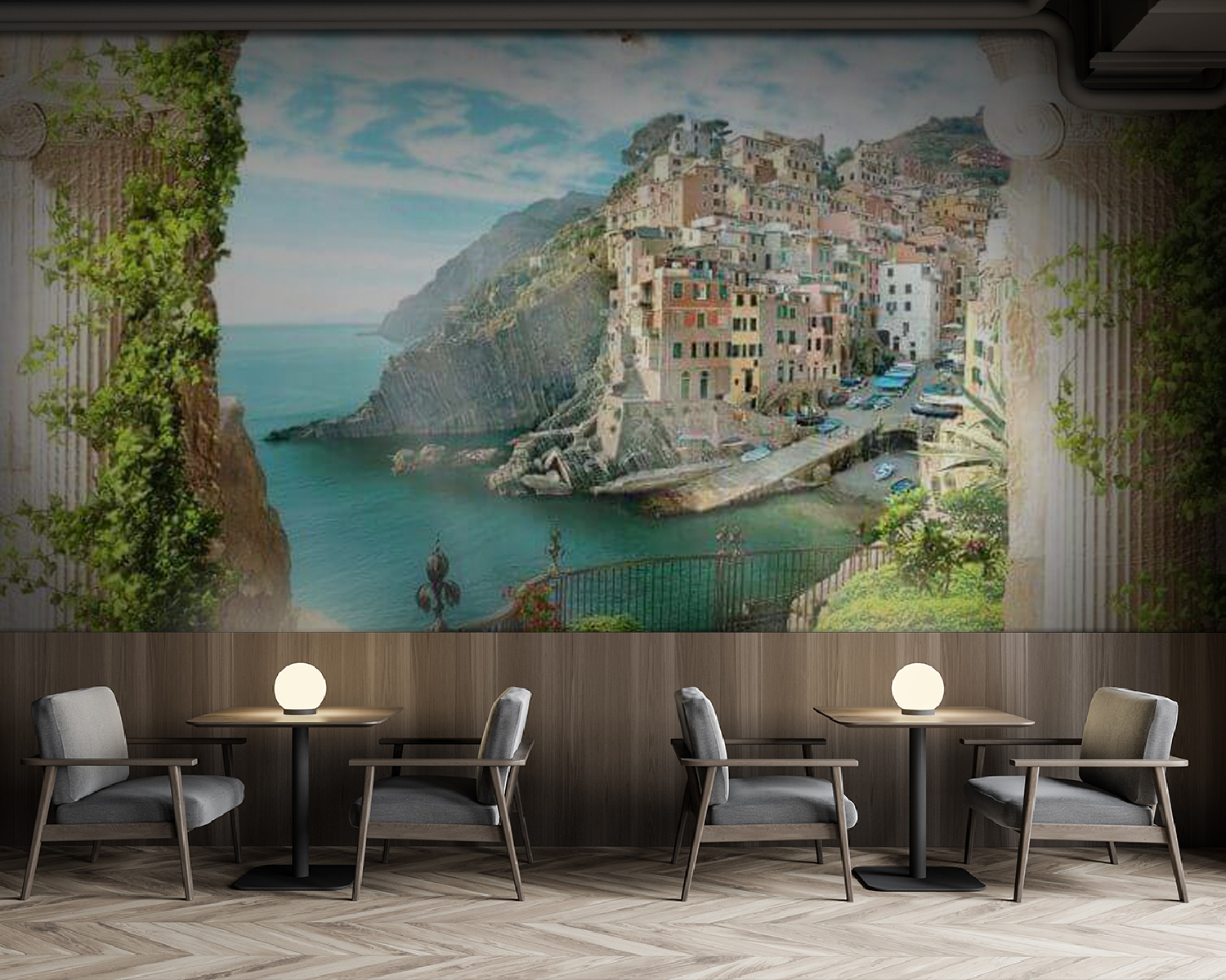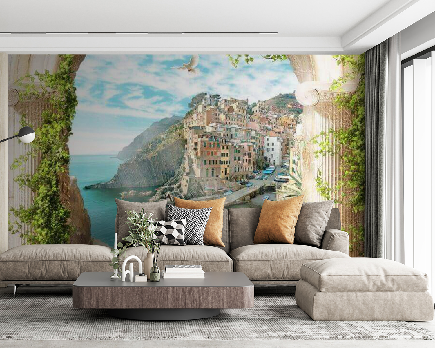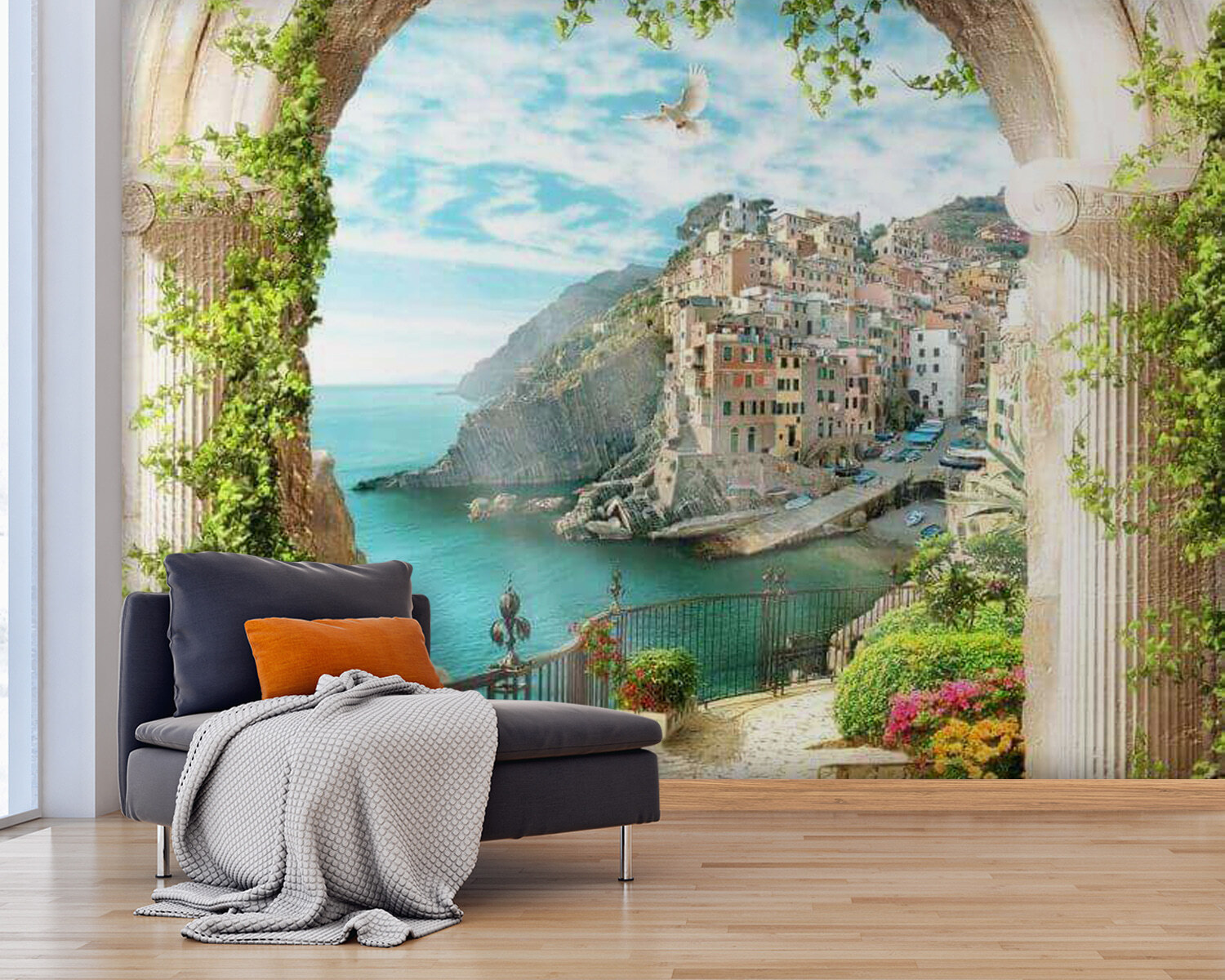Trasportate il vostro spazio in un rifugio costiero da sogno con il murale “Carta da parati Plant in a Pot”! Oh, la vista – che si affaccia su un incantevole villaggio sul mare attraverso un incantevole arco, avvolto da una vegetazione lussureggiante. Immaginate di sorseggiare il vostro caffè mattutino mentre la luce del sole danza sull’acqua… È come una mini-vacanza ogni volta che la si guarda!