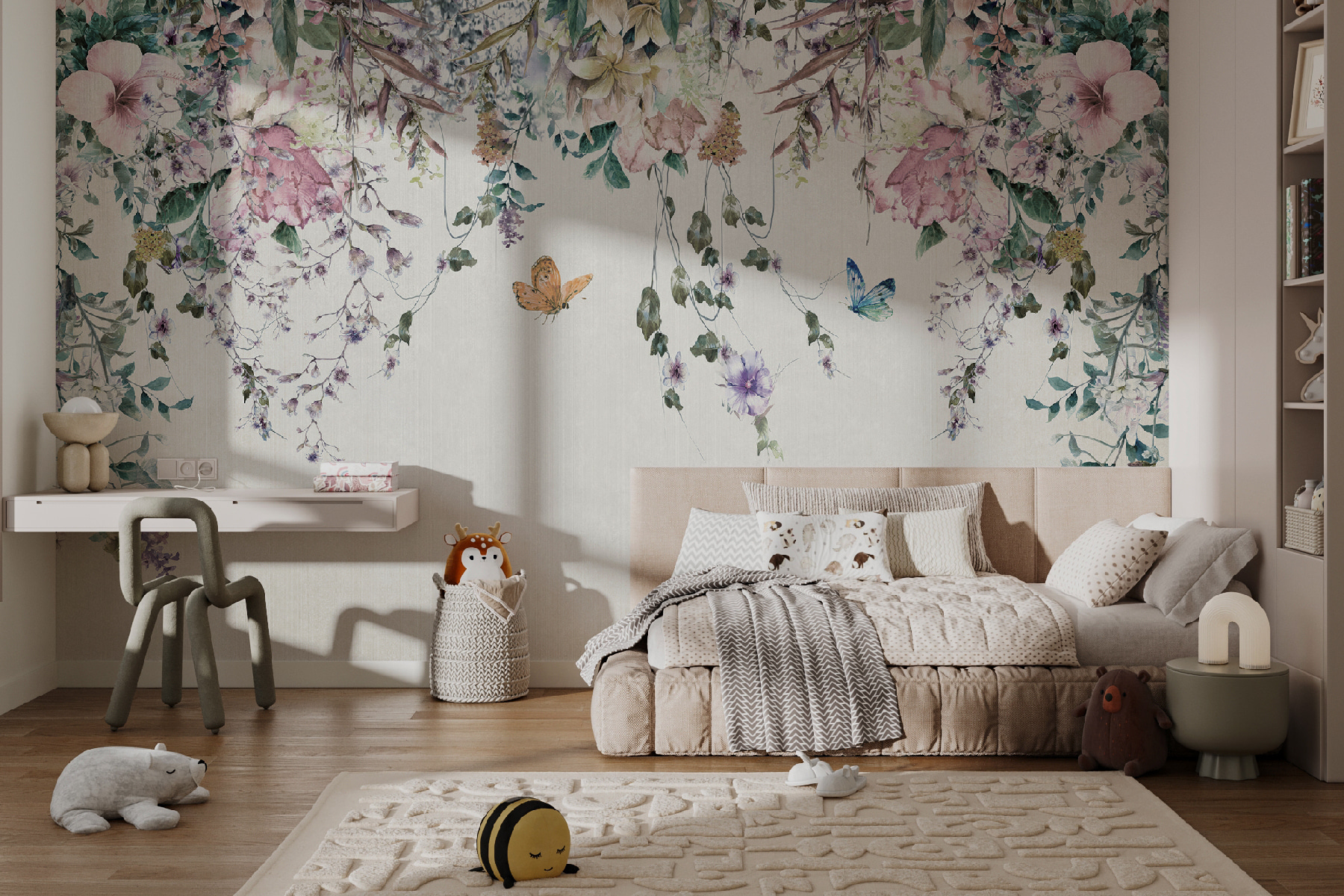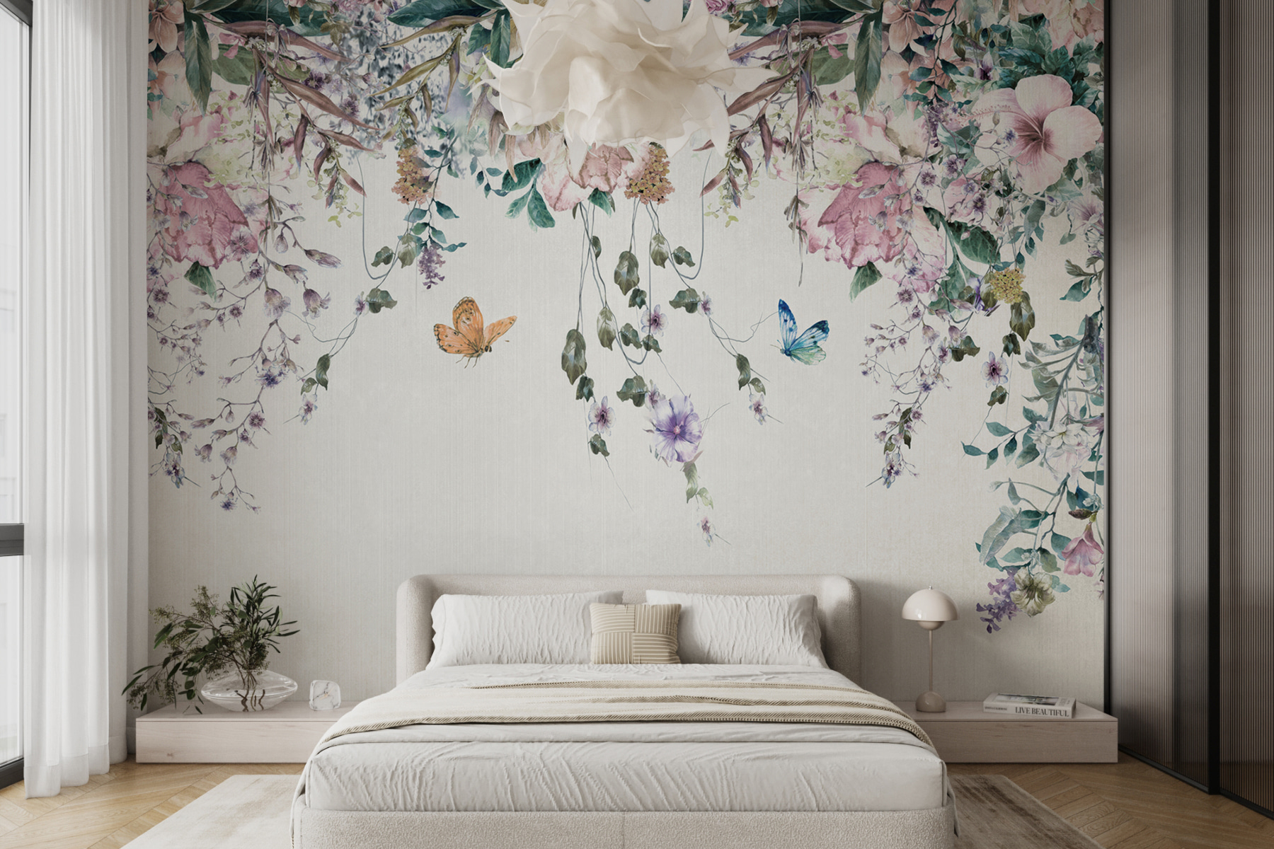 Questo murale non è solo una decorazione, è un’atmosfera. Immaginatevi mentre vi rilassate dopo una lunga giornata, circondati da fiori e farfalle fluttuanti… tranquillo, vero? È come avere una fetta di paradiso personale. Quindi perché aspettare? Lasciate che le vostre pareti raccontino una storia di eleganza e fascino vivace!