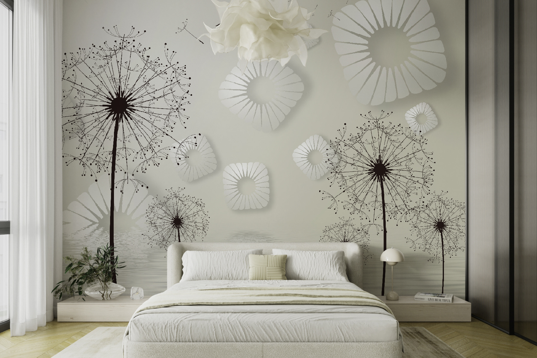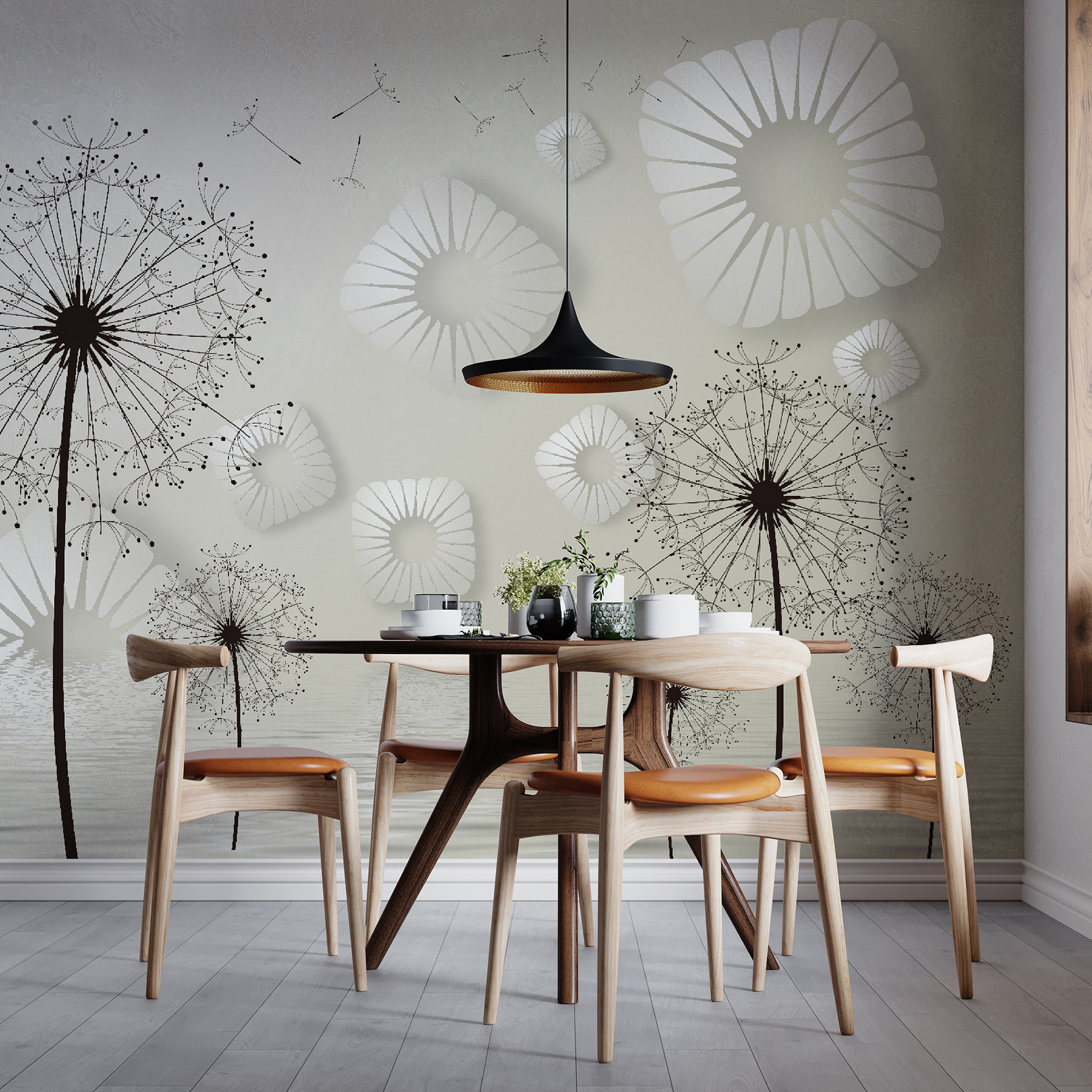 Trasformare uno spazio può sembrare una magia e questo murale cattura perfettamente questa atmosfera. Immaginate di entrare in una stanza dipinta con delicati denti di leone, le cui forme incantevoli e vaporose invitano a sognare ad occhi aperti e ad essere stravaganti. I disegni circolari bianchi fluttuano come nuvole, aggiungendo un tocco leggero e arioso che sembra fresco e invitante.