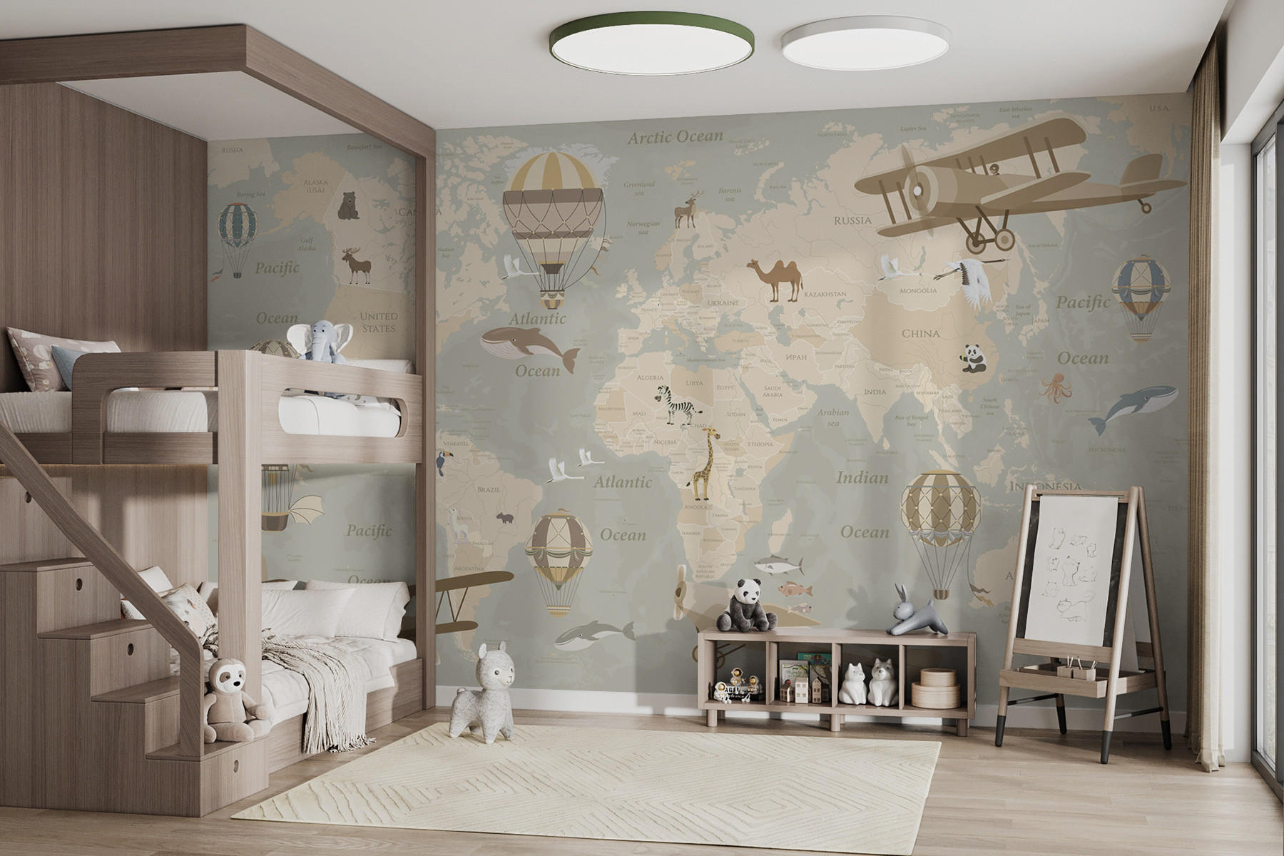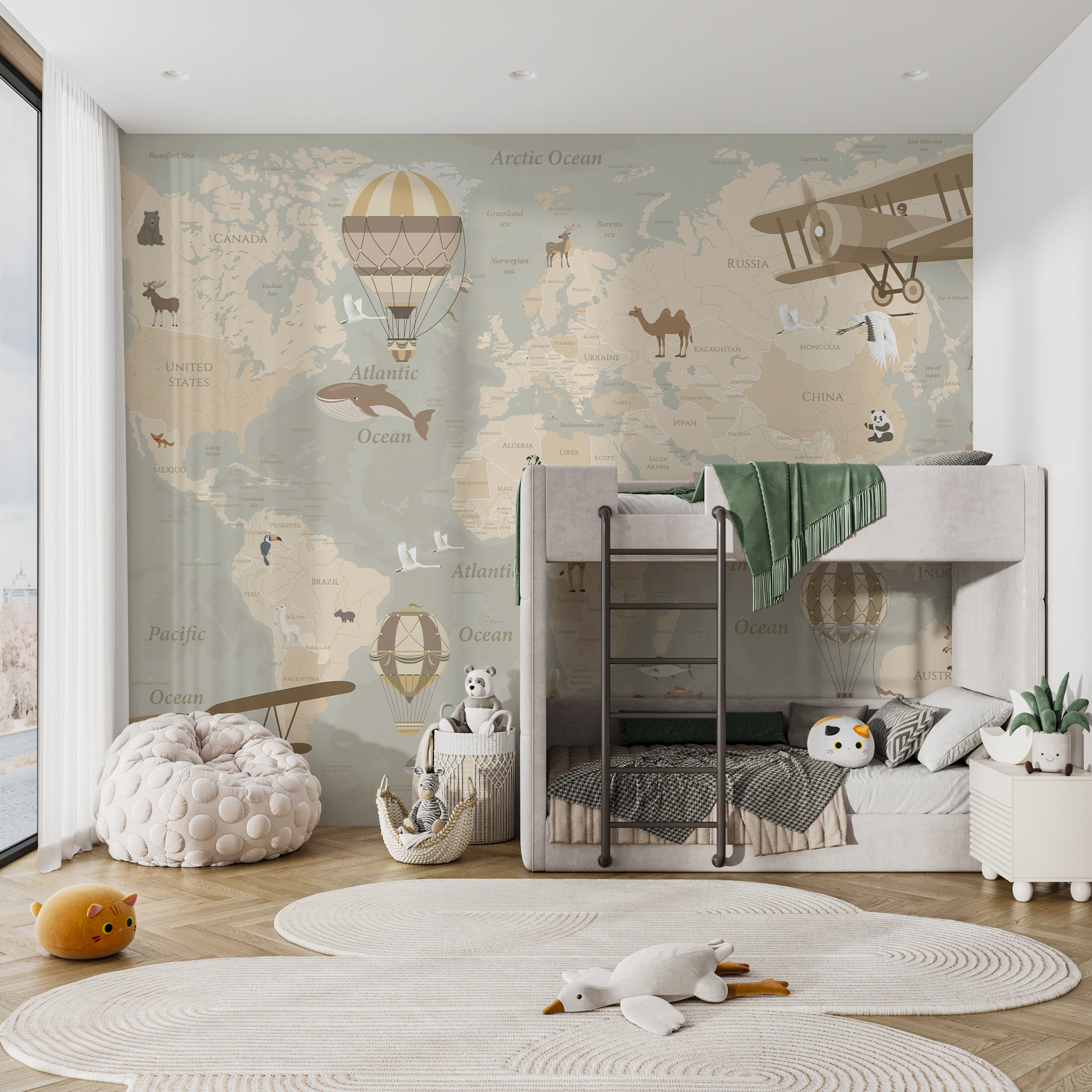 Immaginate i vostri piccoli esploratori che partono per avventure immaginarie: un giorno volano su un biplano sopra l’Africa, l’altro galleggiano su una mongolfiera sopra l’Australia. È perfetto per stimolare la curiosità e trasformare le pareti in una tela di sogni. Inoltre, ha un’atmosfera vintage che può essere apprezzata anche dagli adulti, come un’opera d’arte e una lezione di geografia. Estroso ma educativo, rende ogni sguardo una mini-vacanza. Quindi, perché accontentarsi di pareti semplici quando si può avere un mondo intero che aspetta di essere esplorato?