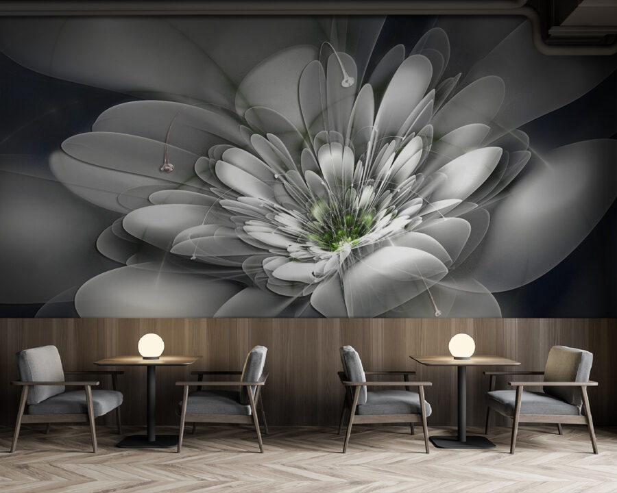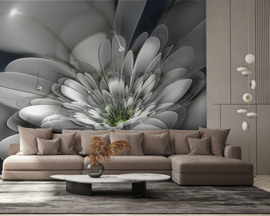 Immaginate di entrare in una stanza che vi sembri immediatamente più leggera, come una boccata d’aria fresca. Questo murale, che raffigura un fiore bianco con un centro verde vibrante, fa al caso vostro. Le sue tonalità tenui e le sue curve aggraziate invitano a un senso di calma e serenità, perfetto per un angolo accogliente o per una zona living vivace.