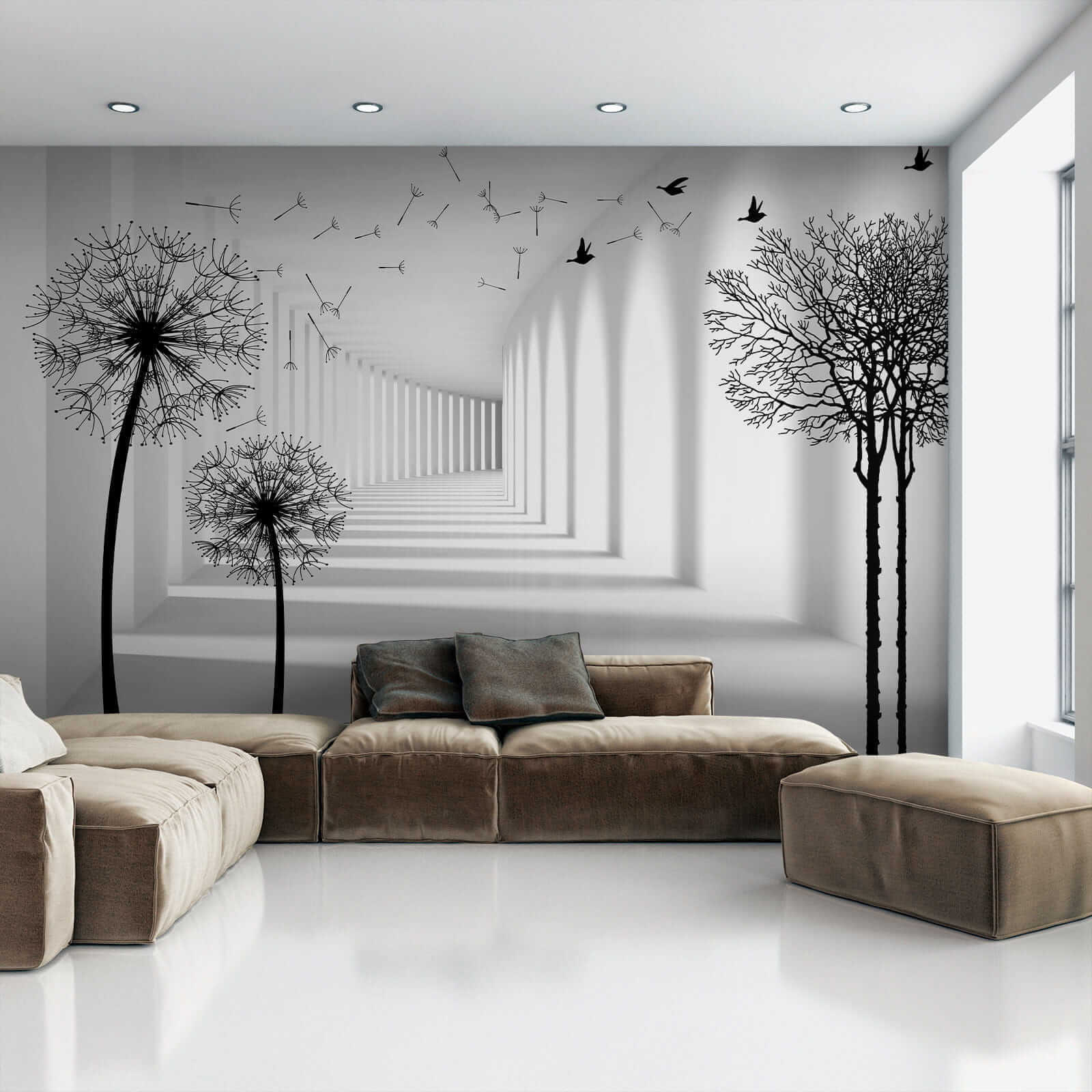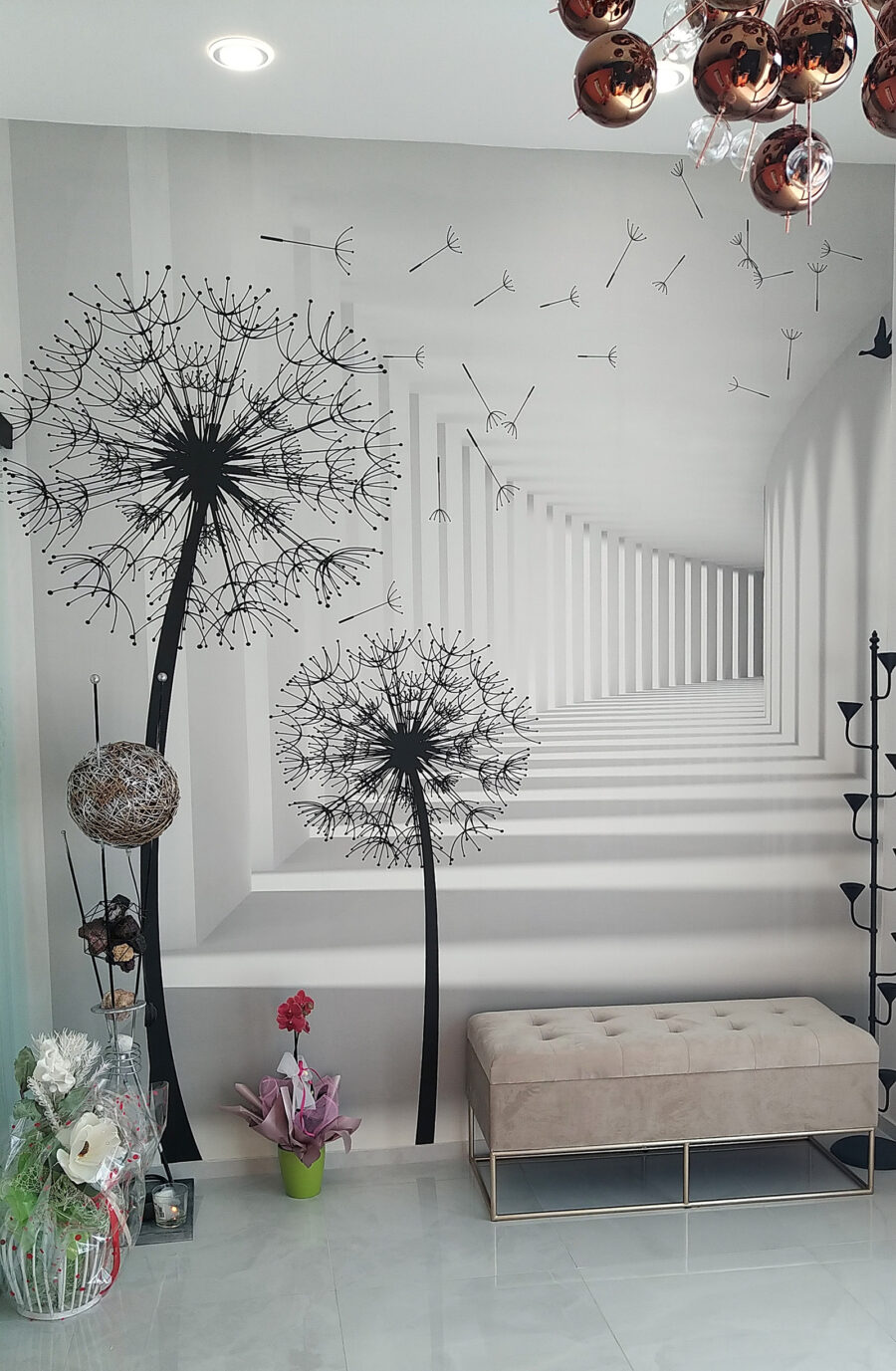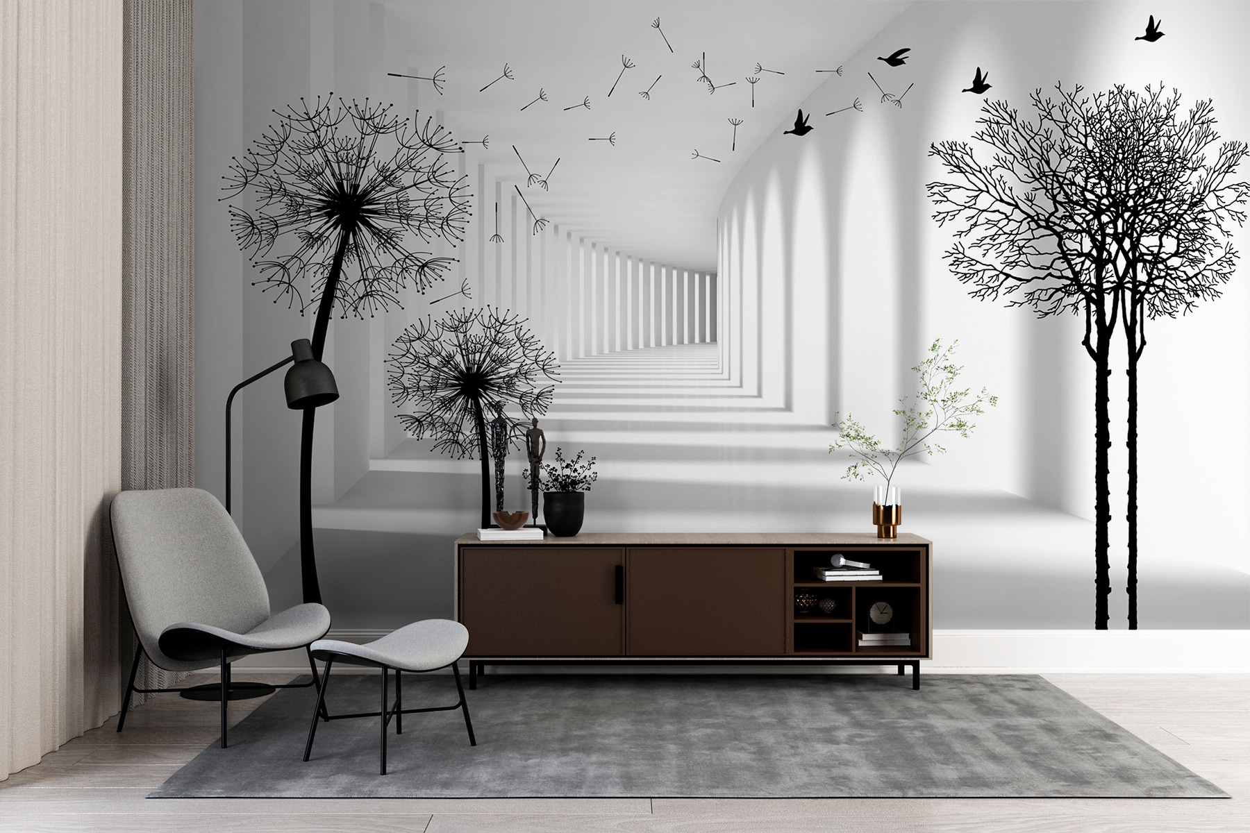 Immaginate di entrare in una stanza ed essere accolti dalla danza stravagante dei denti di leone! Questo murale, intitolato “Black Silhouette of a Dandelion”, fa proprio questo: è come catturare una giornata morbida e ventilata all’interno. Le suggestive sagome nere su uno sfondo luminoso creano un contrasto sorprendente. Il bello è che sembra allungare lo spazio, facendo sembrare ogni stanza più grande… e più aperta. Inoltre, quei semi galleggianti hanno qualcosa di rilassante, vero? È quasi come se si sentisse soffiare una leggera brezza.