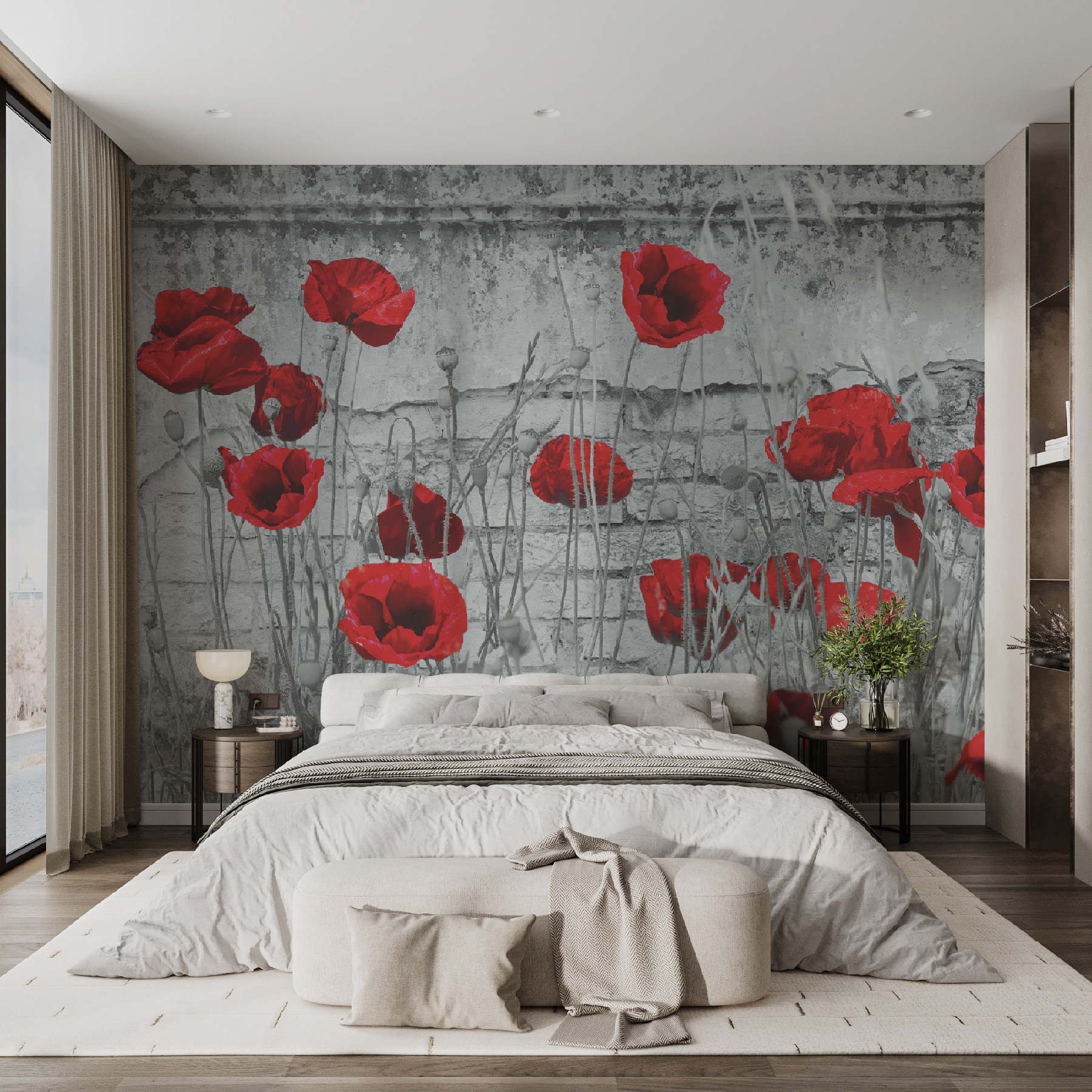 Immaginate di entrare in una stanza e di essere immediatamente accolti da una spruzzata di papaveri rossi e vivaci su una parete rustica e segnata dalle intemperie. Questo murale è come un bellissimo giardino segreto in cui ci si imbatte nel bel mezzo della città. È tutta una questione di contrasti: fiori infuocati su uno sfondo robusto, che creano un’atmosfera al tempo stesso accogliente e tagliente. Pensateci: ogni sguardo a quei petali vibranti potrebbe rallegrare l’umore, soprattutto in una giornata di pioggia. Ideale per chi ama un tocco di natura e un pizzico di drammaticità nell’arredamento. Inoltre, chi non vorrebbe sentirsi un po’ artistico ogni volta che ci passa davanti? E poi, la manutenzione è decisamente inferiore a quella di un giardino vero e proprio!