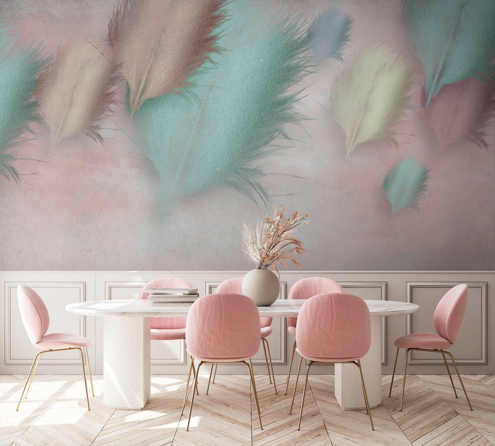 Trasforma qualsiasi stanza in un rifugio accogliente con questo murale da sogno, “Gruppo di piume su sfondo rosa”. È come avvolgere il tuo spazio in un morbido abbraccio pastello. Ogni piuma danza leggermente su una tela color cipria, evocando pensieri di brezze delicate e pomeriggi pigri. Immagina di sorseggiare un tè o un caffè mentre ti godi l’atmosfera rilassante, magari immaginando anche qualche conversazione profonda con la parete. Perfetto per camerette, salotti o qualsiasi altro luogo in cui sia necessario un tocco di serenità. Questo murale non è solo una decorazione, è una piccola fuga proprio a casa tua!