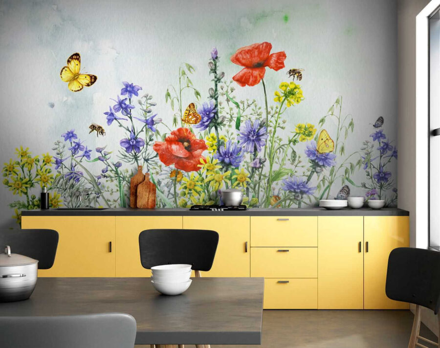 Immaginatevi la vostra stanza con l’atmosfera allegra di un giardino primaverile, direttamente sulla vostra parete! Questo è ciò che offre “Carta da parati Vibrant blossoms and fluttering butterflies”. Questo murale fonde senza sforzo la bellezza lussureggiante dei fiori di campo con le graziose farfalle che danzano a mezz’aria. È come catturare una perfetta giornata di sole!