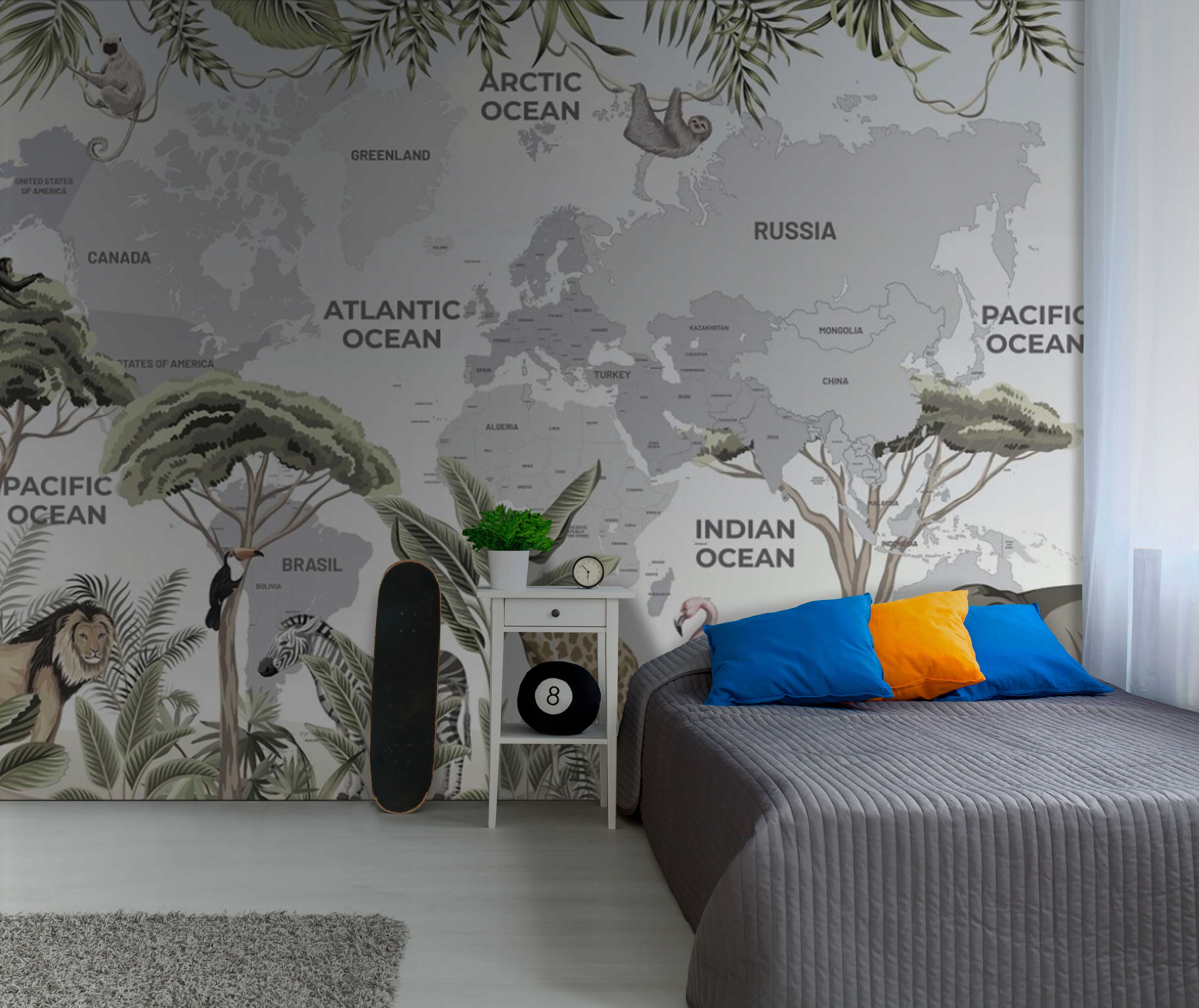 Immaginate di portare una fetta di natura selvaggia nel vostro spazio con questo delizioso murale! “Giraffa in piedi accanto a un albero” unisce perfettamente gli affascinanti animali con uno sfondo di mappe del mondo. È come un mini safari, senza il jet lag. Immaginate i bambini che si meravigliano della giraffa, che individuano il fenicottero, che indovinano i continenti… e che imparano la geografia nel modo più favoloso. Ogni volta che si passa di lì, non si può fare a meno di sorridere al bradipo giocoso che si aggira nei paraggi. Non è solo un murales: è un elemento di conversazione, uno stimolo a sognare ad occhi aperti, una piccola fetta di avventura! Perfetto per le camere dei bambini, è ricco di dettagli deliziosi che faranno crescere la loro curiosità per il mondo.