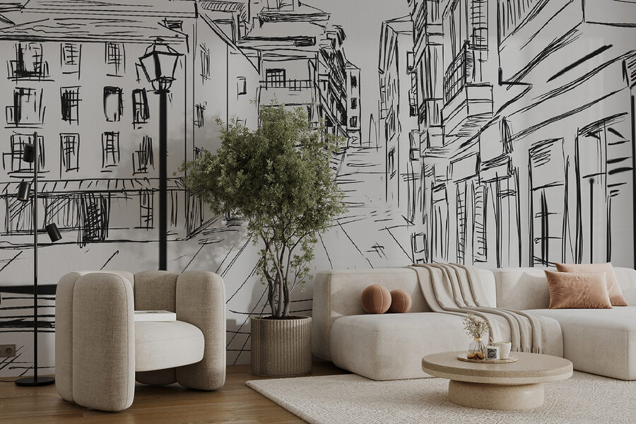 Immaginate di rilassarvi nel vostro salotto con questo splendido murale in bianco e nero sulla parete. È come uno schizzo stravagante che prende vita! Le linee giocose che catturano una scena urbana, con tanto di panchina solitaria ed edifici imponenti, conferiscono un tocco artistico che vi farà sognare le strade europee.