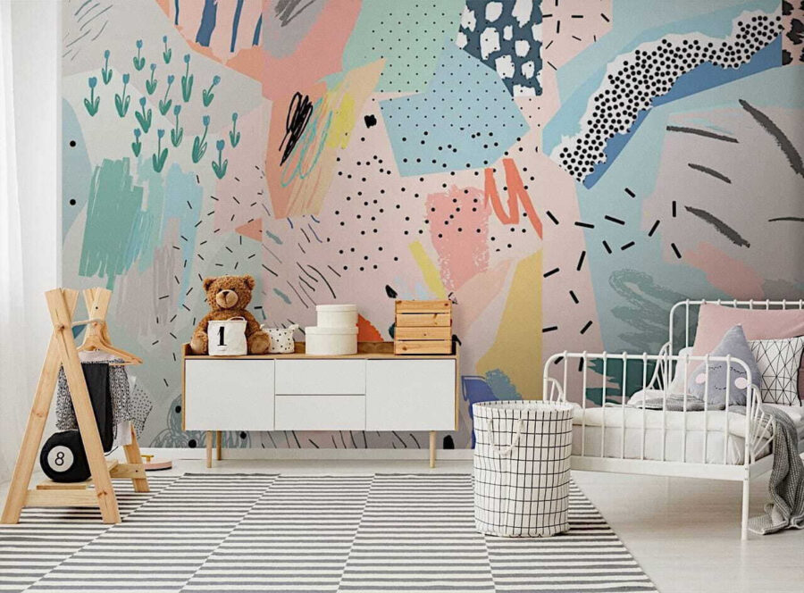 La stanza di un bambino ha bisogno di una spruzzata di magia? Date un’occhiata a questo coloratissimo murale astratto: è come una giocosa trapunta patchwork per le vostre pareti. Troverete spruzzi di tenui colori pastello mescolati a pezzi più audaci; le piccole macchie di colore e le forme eccentriche sono semplicemente da sogno. Immaginate l’immaginazione del vostro bambino che si scatena con tutti questi motivi divertenti da guardare! È come se un libro di fiabe fosse esploso sulla parete, nel modo migliore possibile.