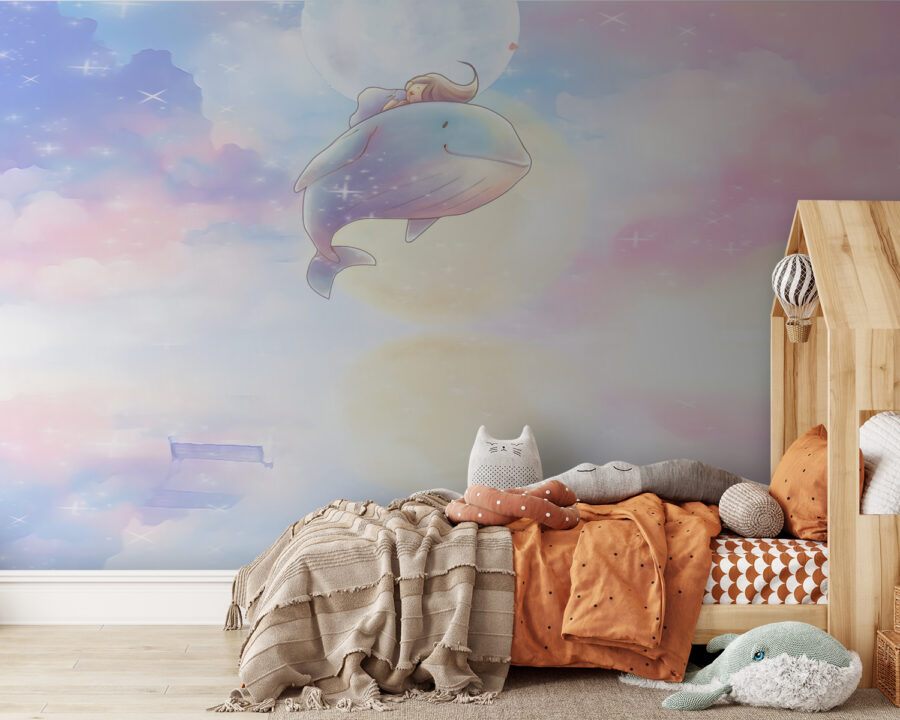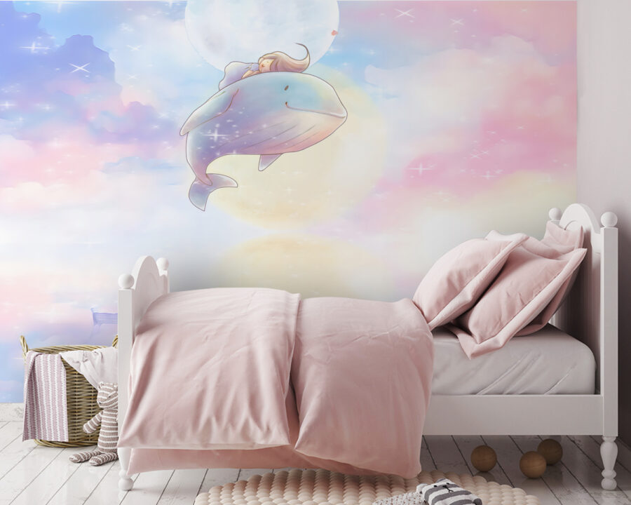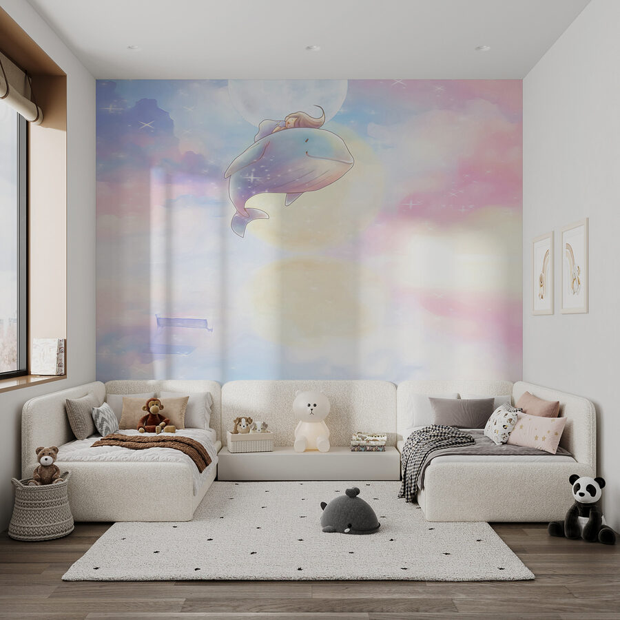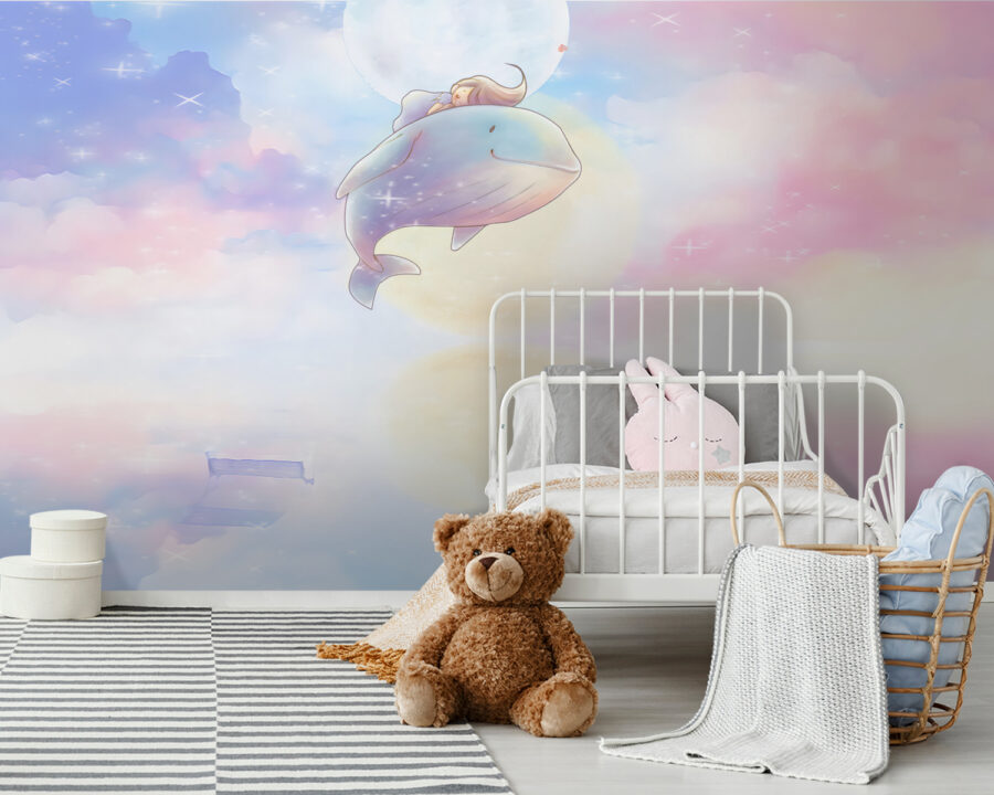 Vi presentiamo il vostro nuovo migliore amico da parete: il murale “Cartoon of a Whale”! Questa scena da sogno è come un dolce viaggio in un mondo magico, dove una simpatica balena accompagna il vostro bambino tra soffici nuvole pastello. Perfetto per la cameretta di una figlia o per qualsiasi spazio creativo!