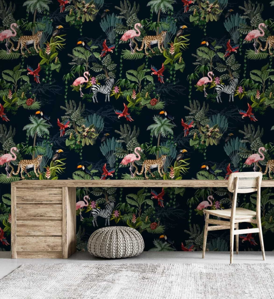 Trasforma qualsiasi parete in un rifugio vivace con questo splendido murale raffigurante fenicotteri e zebre immersi in una rigogliosa vegetazione tropicale. È come portare un piccolo angolo di natura selvaggia direttamente nel tuo salotto o, se ti senti audace, nel tuo bagno! Immagina di entrare in una giungla lussureggiante ogni volta che ci passi davanti. I colori intensi risaltano sullo sfondo più scuro, rendendolo il contesto perfetto per incontri intimi o momenti di relax in solitudine. Inoltre, è un ottimo spunto di conversazione: chi non ama chiacchierare della fauna esotica? Questo murale non è solo un elemento decorativo, è un’esperienza. Quindi, valorizza quella parete spoglia e lascia che l’atmosfera della giungla ti avvolga!