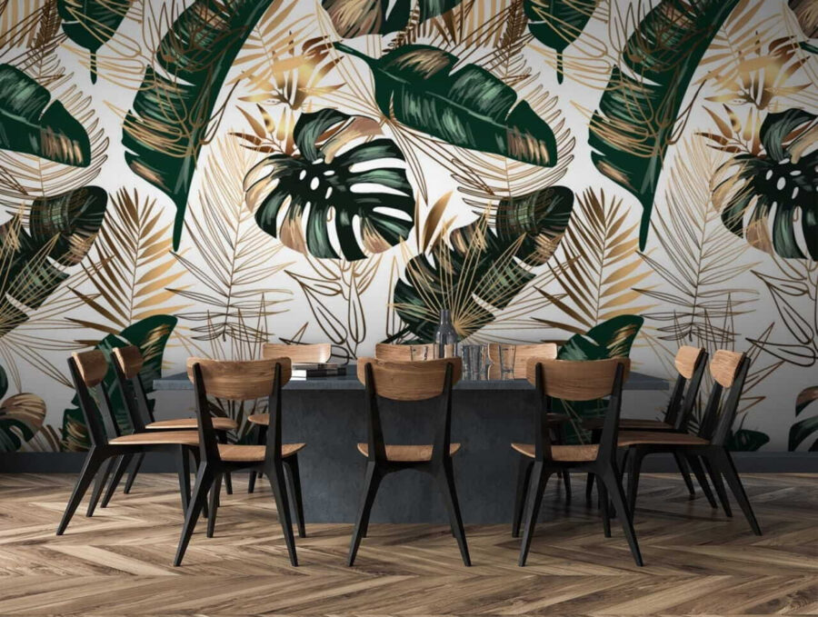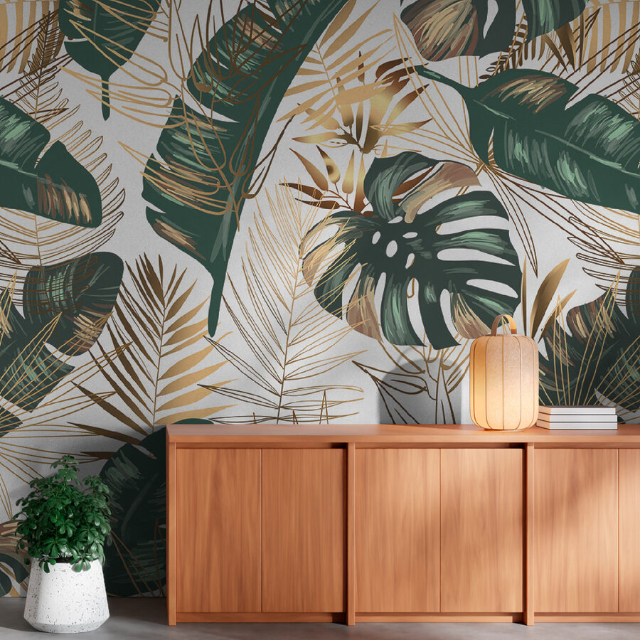 Trasformate qualsiasi stanza in un paradiso tropicale con questi vivaci murales che presentano foglie lussureggianti e giocosi motivi astratti. Immaginate di entrare nel vostro salotto e di sentirvi come se foste appena atterrati in una ventilata isola di fuga: quei verdi e quegli ori invitano al relax. Che si tratti di un angolo accogliente per la lettura o di uno spazio vivace per riunire gli amici, questo murale aggiunge il tocco perfetto di personalità. È come un dolce promemoria per rallentare e immergersi nella bellezza che ci circonda. Chi non vorrebbe sorseggiare un drink e fingere di essere in vacanza proprio a casa propria?