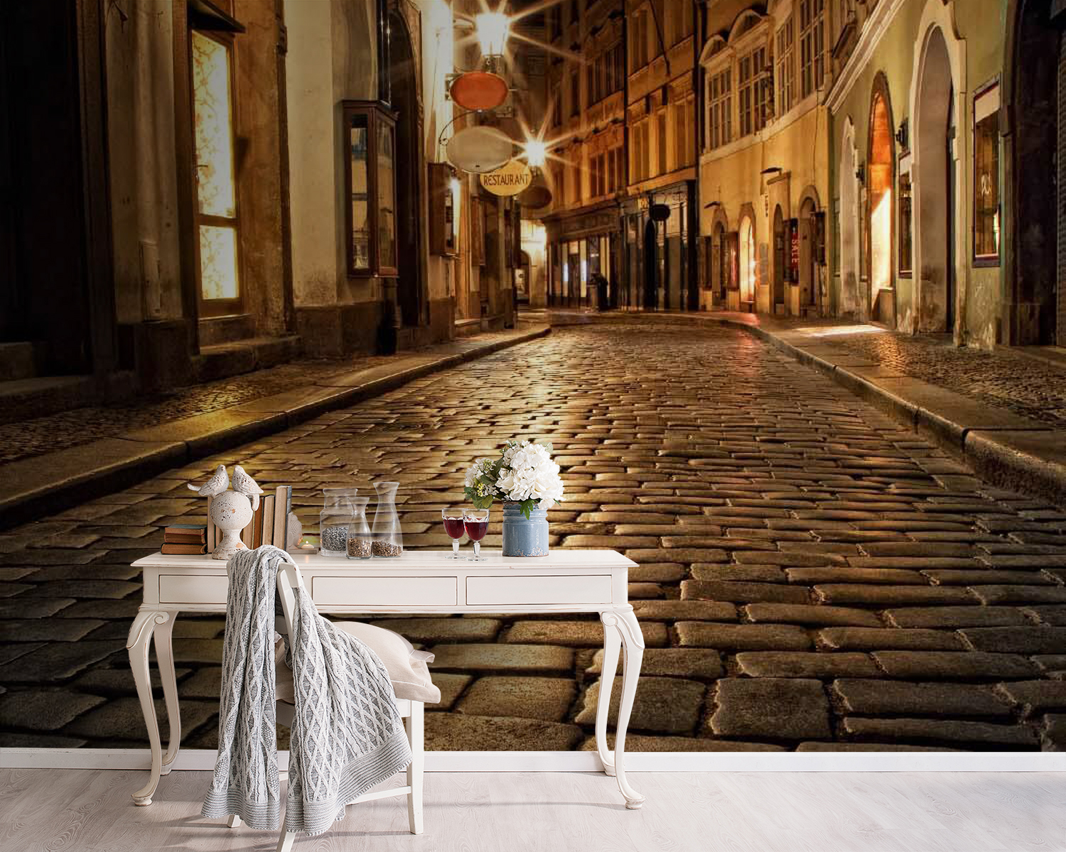 Transform any room into a cozy corner of a charming city with this mural, “Stone Street with Buildings and Street Lights.” Imagine stepping into a scene where cobblestones glisten under soft streetlamp glow. It’s like inviting a piece of a whimsical night stroll right into your home. The warm hues evoke a sense of nostalgia, making it perfect for a dining nook or a relaxing reading area. Picture curling up with a book while sipping your favorite tea, with the comforting feel of an evening stroll surrounding you. Perfect for those who crave a bit of urban magic!