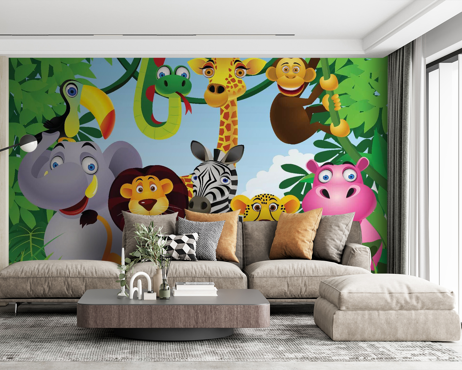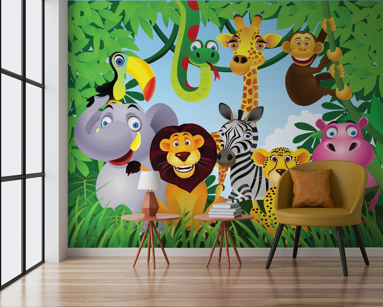 Transform any space into a vibrant jungle adventure with this cheerful wall mural featuring a lively crew of animals. Picture an elephant with a goofy grin, a dancing giraffe, and a wise old lion—each one bursting with personality! This mural isn’t just decor; it’s a doorway to imagination. Kids will love spotting their favorite creatures while adults might just catch a glimpse of their inner child. Perfect for playrooms or nurseries, it brings a splash of fun and laughter to the walls. Who wouldn’t want their space to feel like a jungle party? It’s practically begging for storytime under its playful canopy! Let the wild times roll!