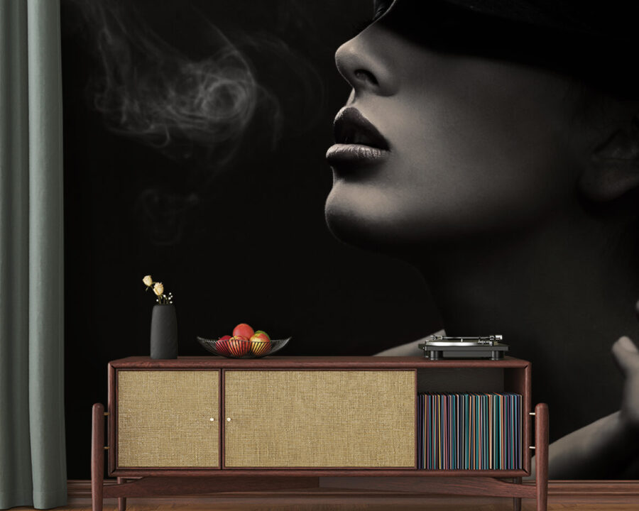 Trasformate il vostro spazio in un rifugio artistico con questo accattivante murale raffigurante una donna con cappello che fuma con disinvoltura. È come entrare in un caffè alla moda dove ogni angolo sussurra eleganza e intrigo. Il modo in cui la donna guarda in lontananza, circondata da un vortice di fumo, aggiunge un tocco di mistero, perfetto per suscitare conversazioni interessanti.