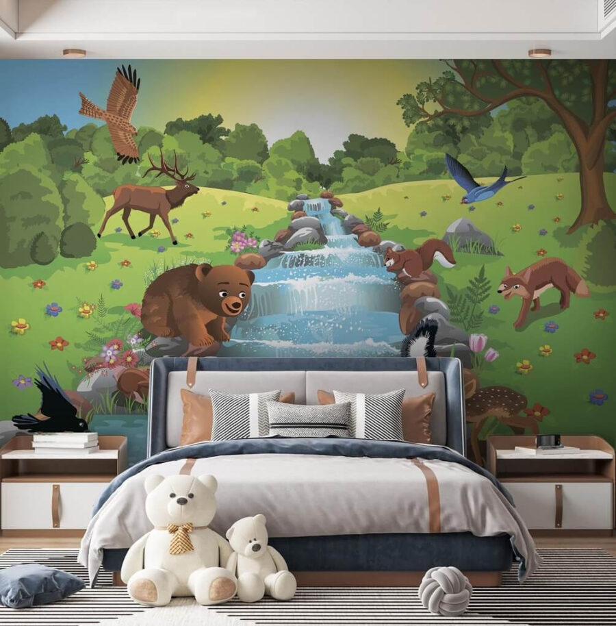Trasforma il tuo spazio in un vivace bosco con questo affascinante murale che raffigura stravaganti amici animali che si godono una giornata di sole vicino a un ruscello scintillante. Immagina un orso che sguazza nell’acqua, un cervo curioso che si china per bere e uno scoiattolo sfacciato che trama il suo prossimo spuntino. Questo murale trasmette un senso di gioia e calore, perfetto per le stanze della famiglia o le aree giochi: è come vivere una mini avventura nella natura proprio a casa tua! Ogni sguardo ti ricorderà i tempi più semplici, l’aria fresca e forse ti farà anche venire voglia di tuffarti nella natura. Abbraccia il fascino della natura e lascia che le tue pareti raccontino una storia!