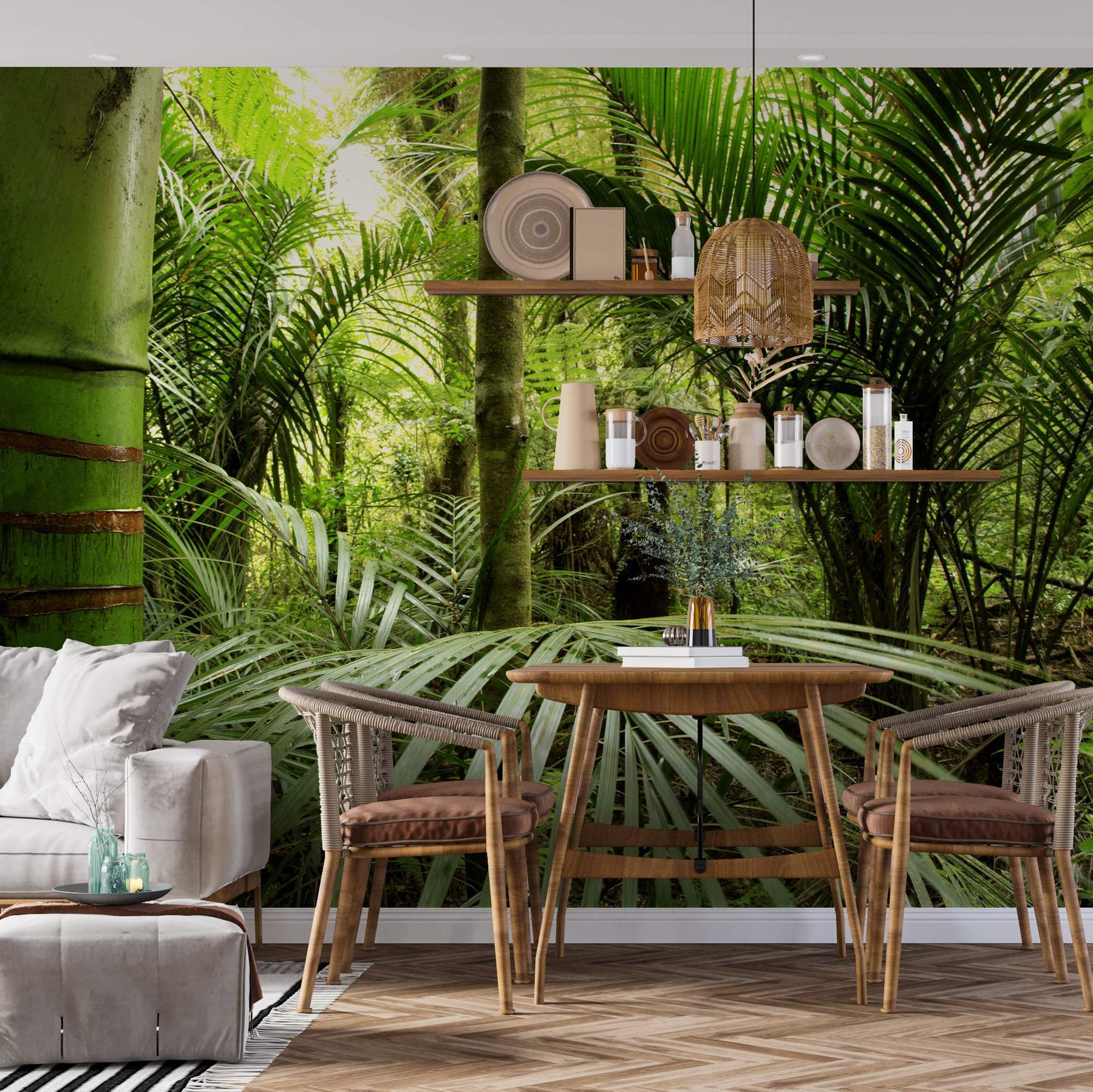 Avete mai sognato di fuggire in un paradiso verde e lussureggiante senza lasciare il vostro salotto? Questo murale raffigurante una giungla verde e lussureggiante con palme è proprio questo. È come entrare in un giardino segreto, senza bisogno di passaporto. Immaginate di sorseggiare il vostro caffè mattutino, sentendovi come in una vacanza esotica. Il verde è così intenso che sembra di sentire il fruscio delle foglie e il cinguettio degli uccelli. Perfetto per creare un rifugio tranquillo e ispirato alla natura in qualsiasi stanza. Per dare al vostro spazio un’atmosfera da giungla, senza bisogno di binocoli.