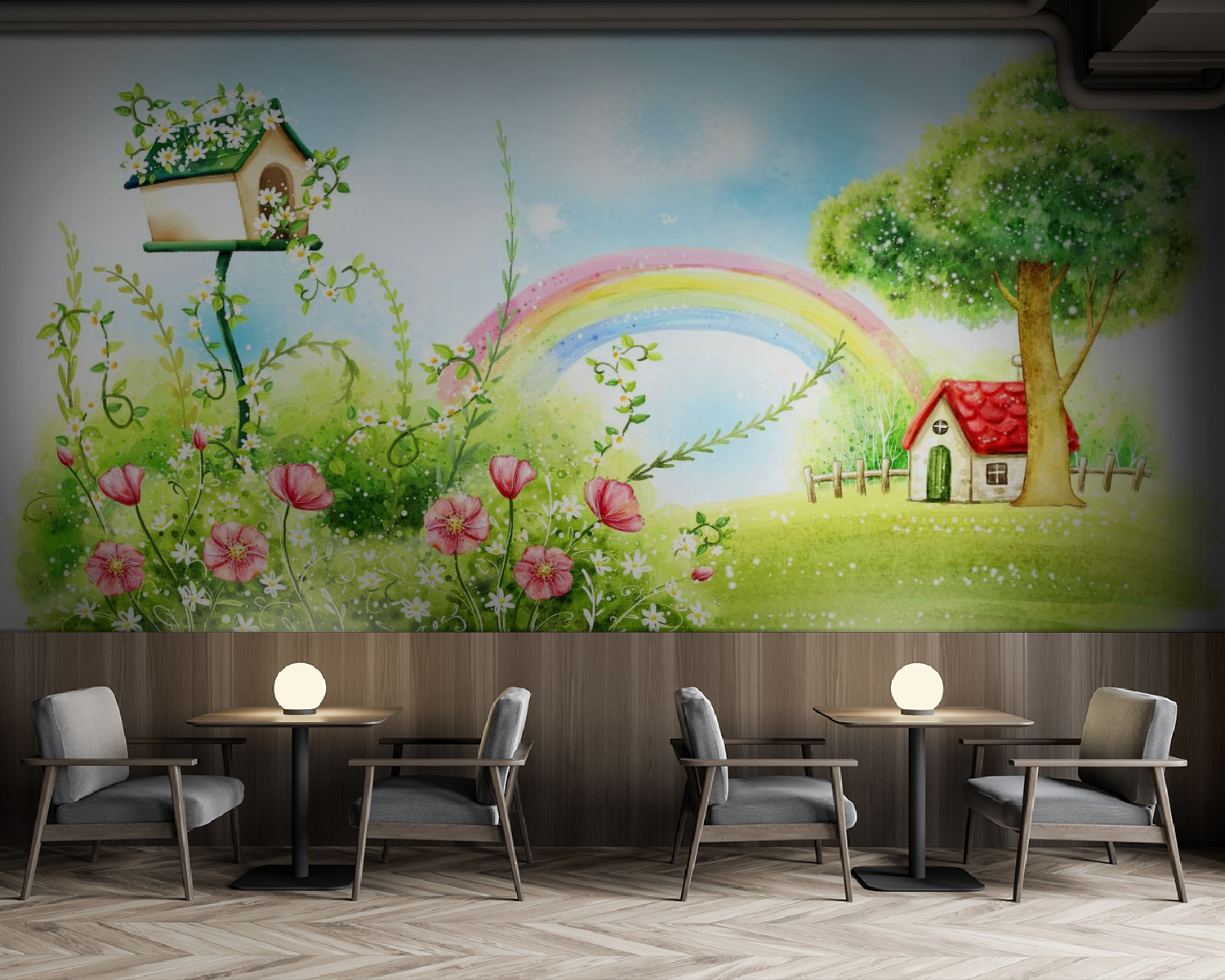 Immaginate di svegliarvi ogni mattina con il fascino di una casetta incastonata sotto un albero, proprio nella stanza del vostro bambino. Il murale “Casa sotto l’albero” sembra uscito da una fiaba. Verdi tenui, rossi vivaci: un’atmosfera sognante e stravagante. Perfetto per stimolare l’immaginazione. E quella casetta per gli uccellini drappeggiata di fiori? Troppo carina! Inoltre, l’arcobaleno aggiunge un tocco di magia. È come un mondo accogliente e incantato in cui i bambini possono rifugiarsi in qualsiasi momento. Pensate alla storia sotto l’albero o ai sogni ad occhi aperti di vivere in una casetta. Questo murale è sicuramente una scintilla di gioia.