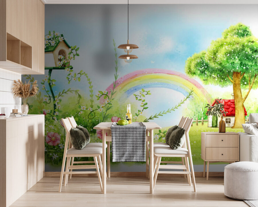 Immaginate di svegliarvi ogni mattina con il fascino di una casetta incastonata sotto un albero, proprio nella stanza del vostro bambino. Il murale “Casa sotto l’albero” sembra uscito da una fiaba. Verdi tenui, rossi vivaci: un’atmosfera sognante e stravagante. Perfetto per stimolare l’immaginazione. E quella casetta per gli uccellini drappeggiata di fiori? Troppo carina! Inoltre, l’arcobaleno aggiunge un tocco di magia. È come un mondo accogliente e incantato in cui i bambini possono rifugiarsi in qualsiasi momento. Pensate alla storia sotto l’albero o ai sogni ad occhi aperti di vivere in una casetta. Questo murale è sicuramente una scintilla di gioia.