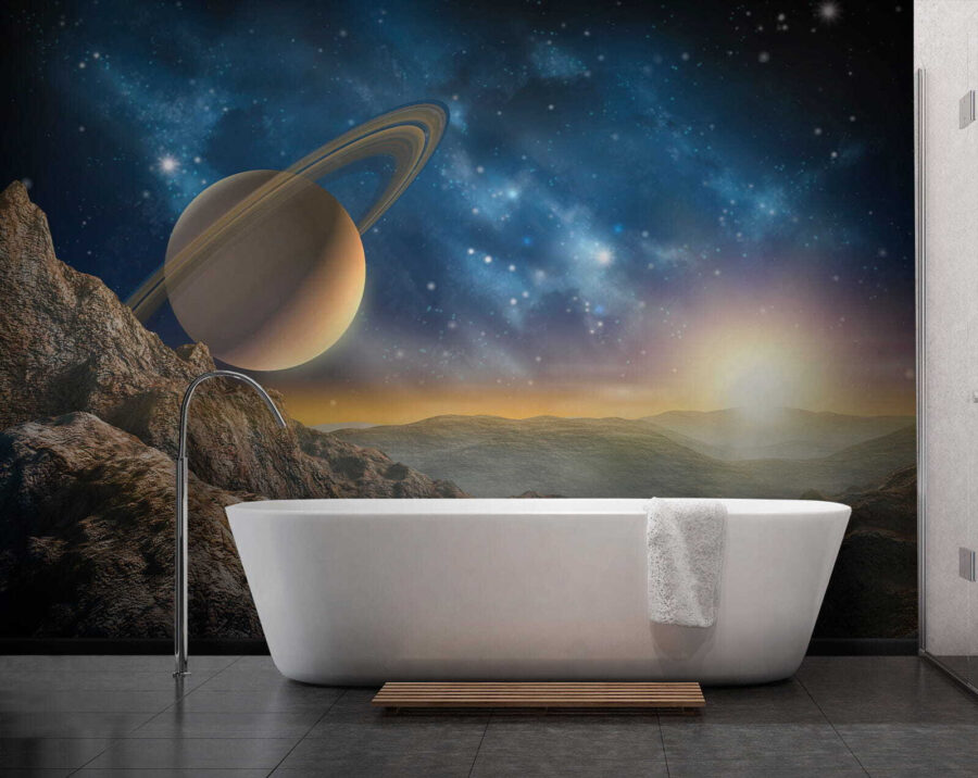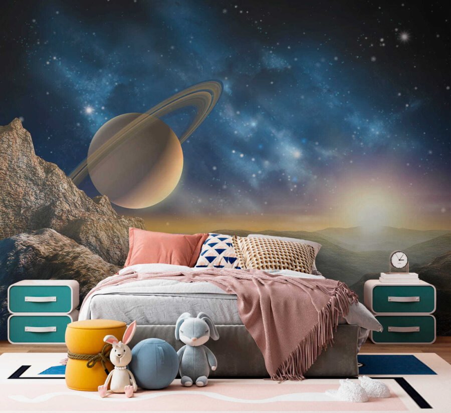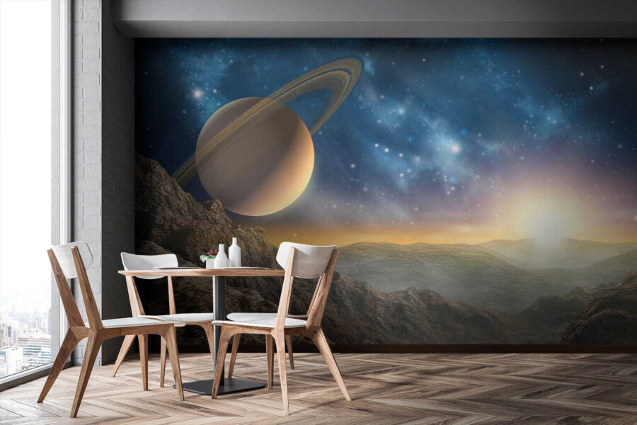 Trasforma una parete semplice in un rifugio celeste con il “Murale Planet with Rings in the Sky”. Questo splendido murale ti trasporta in un panorama da sogno, dove maestose montagne incontrano un pianeta maestoso adornato da favolosi anelli. Immagina di rilassarti in un salotto dove i raggi del sole mattutino illuminano questa scena cosmica con una luce calda. È come avere un pezzo di universo direttamente a casa tua! Gli amici entreranno e rimarranno a bocca aperta, mentre tu sorseggerai tranquillamente il tuo tè, sentendoti come un esploratore intergalattico. Perfetto per chi ama guardare le stelle o desidera semplicemente dare un tocco di ispirazione cosmica al proprio spazio: ecco un ottimo spunto di conversazione!