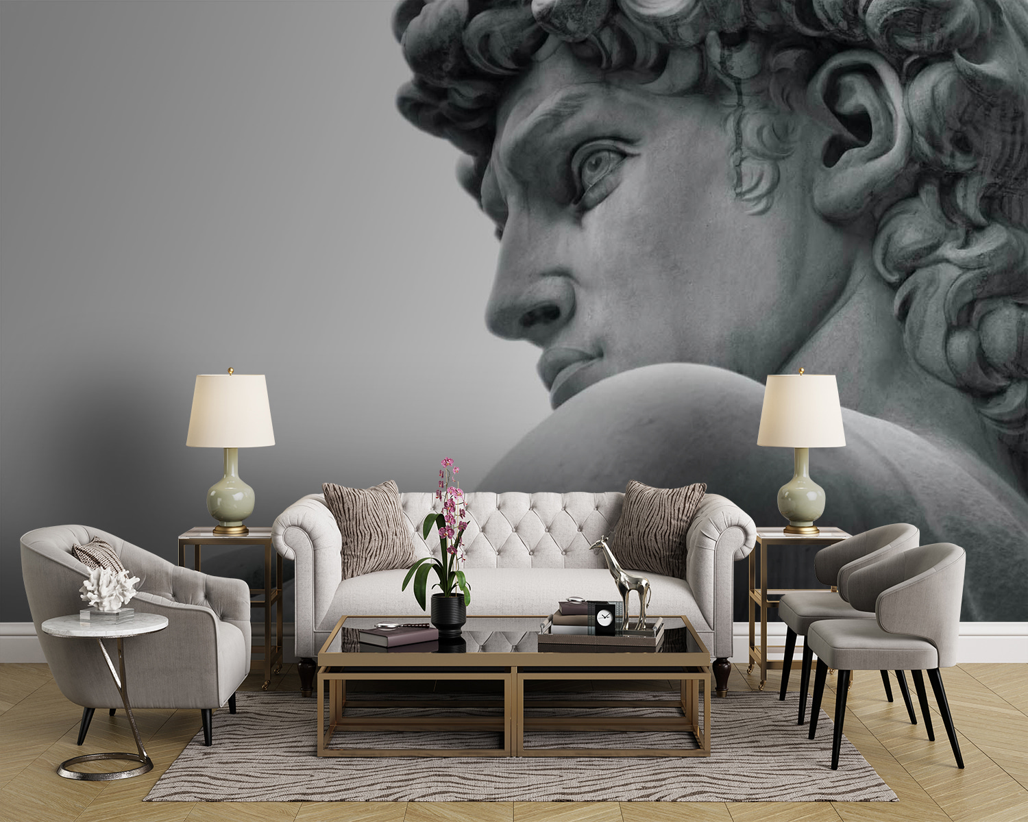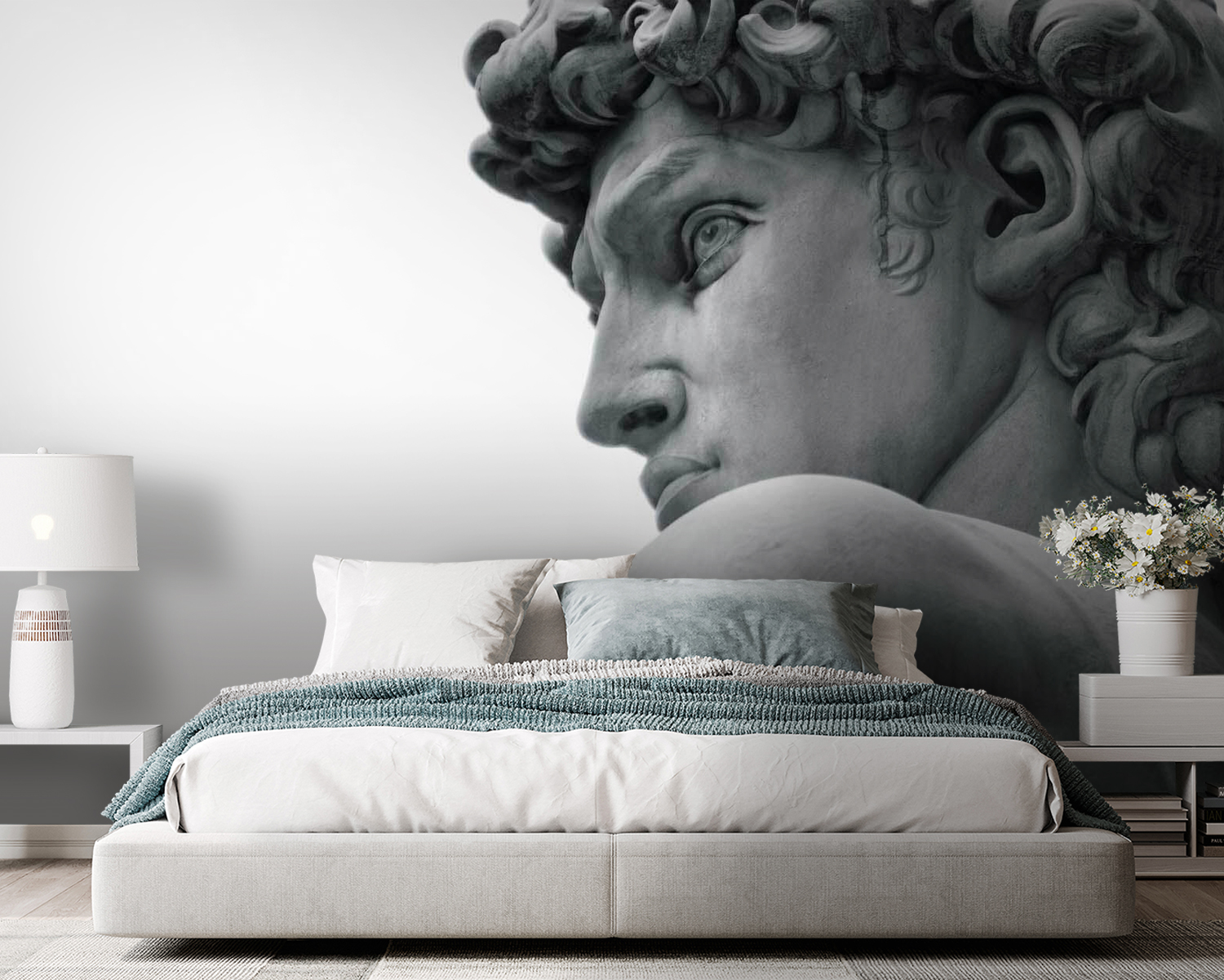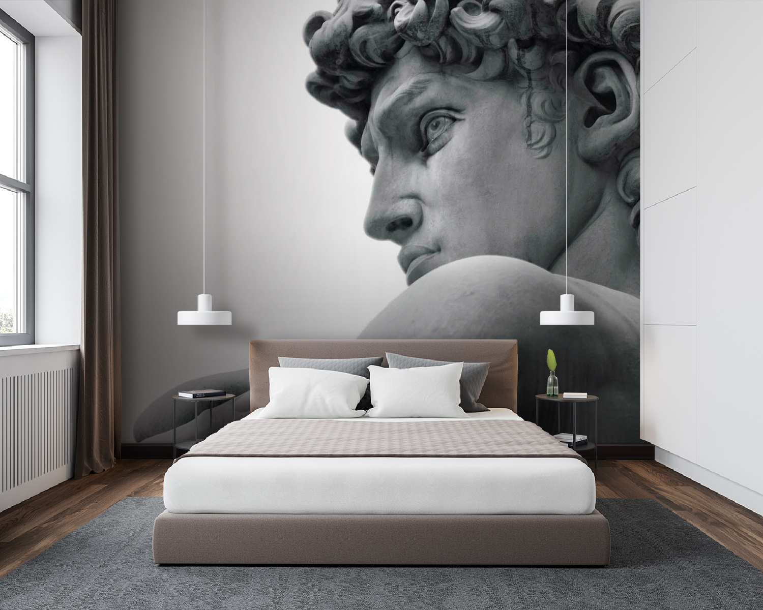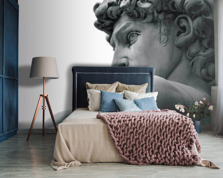 Questo murale raffigurante una statua di un uomo è come portare un pezzo di un grande museo direttamente nel vostro spazio. Immaginate di avere questo volto straordinario e senza tempo a vegliare sul vostro salotto: è un’occasione di conversazione immediata, no? È perfetto per chi desidera un po’ di eleganza classica, ma in un ambiente fresco e moderno. I dettagli sono così vividi che si può quasi percepire la fresca morbidezza del marmo. Potrebbe trasformare una parete ordinaria in un punto focale di grande effetto. Ogni volta che lo scorgerete, vi sentirete un po’ più colti e sofisticati!