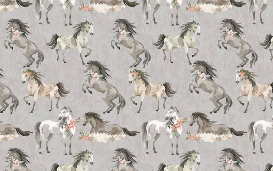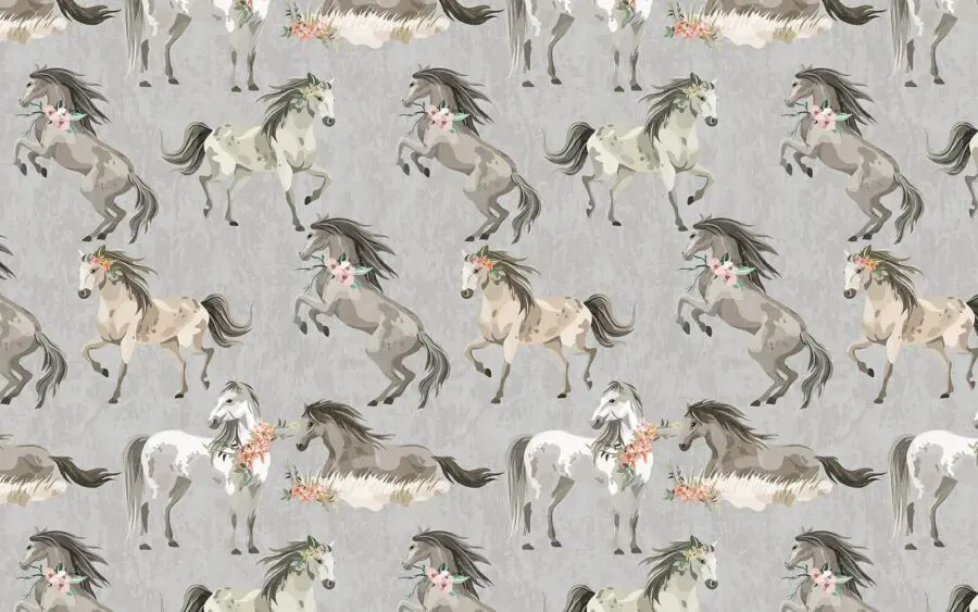 Immaginate di entrare in una stanza e di essere accolti da questi maestosi stalloni: è come entrare in un sogno stravagante! Il murale “Cavallo con fiori nei capelli” è una vera festa per gli occhi. Ogni cavallo, ornato da delicati fiori, saltella sulla parete, conferendo un’atmosfera giocosa e serena a qualsiasi spazio.