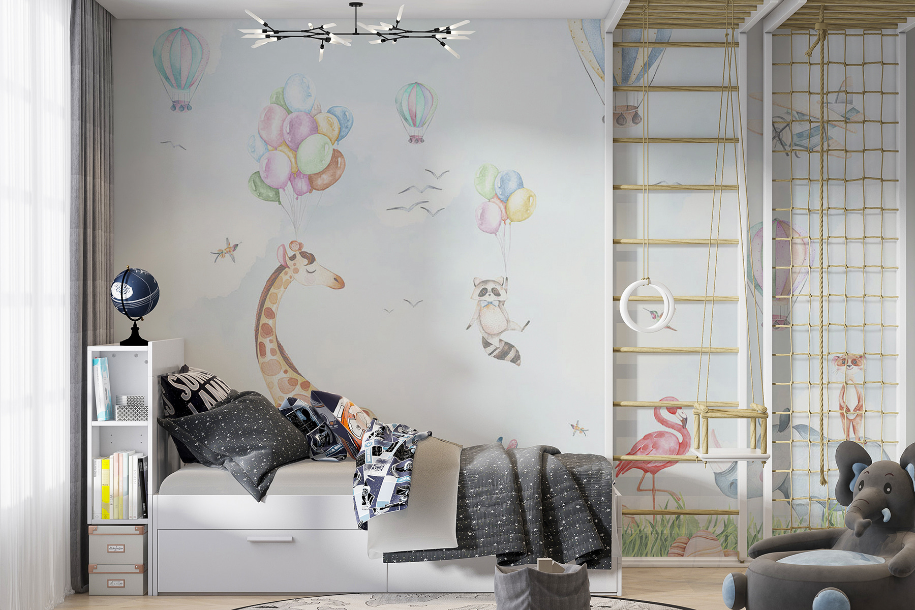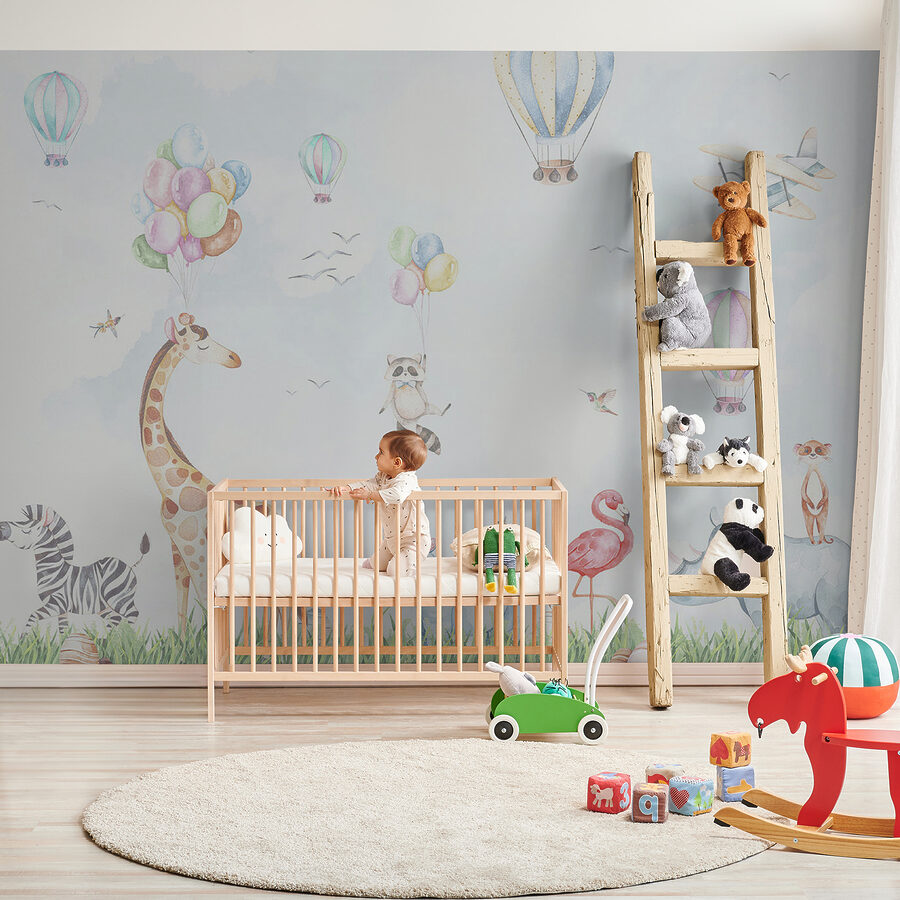 Volete ravvivare la stanza di un bambino con un tocco di fascino? Date un’occhiata a questo adorabile murale in cui un rinoceronte, una volpe e i loro stravaganti amici sono al centro della scena! Immaginate un sereno paese delle meraviglie ad acquerello, pieno di mongolfiere, animali giocosi e un cielo che sembra un abbraccio morbido e sognante. Questo murale non è solo bello, è magico. Immaginatevi il vostro bambino che si sveglia ogni mattina in un safari di sorrisi, con una giraffa che tiene in mano dei palloncini e un procione pronto a esplorare. È come se un libro di fiabe prendesse vita e invitasse a vivere avventure e risate di ogni tipo. Perfetto per stimolare la creatività e rendere più incantevole il momento della nanna. Aggiungete questo delizioso pezzo alle vostre pareti e osservate l’allegria che si sprigiona!