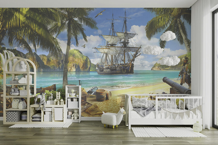 Trasformate qualsiasi stanza in una vivace avventura con questo sorprendente murale. Immaginate di entrare in uno spazio in cui i colori vivaci vi trasportano in un paradiso tropicale, con una maestosa nave e un pirata giocoso che fa la guardia! Questo murale non è solo una decorazione, ma una porta d’accesso all’immaginazione. I bambini ameranno il mix di fantasia ed eccitazione, mentre gli adulti si ritroveranno a ricordare cacce al tesoro e fughe rocambolesche. È come fare una mini-vacanza a casa! Trasformate una parete ordinaria in uno scenario straordinario che stimola la gioia e la creatività ogni volta che ci passate davanti. Immaginatevi un accogliente angolo di lettura o una stanza dei giochi per bambini che sembra un viaggio, ogni giorno.