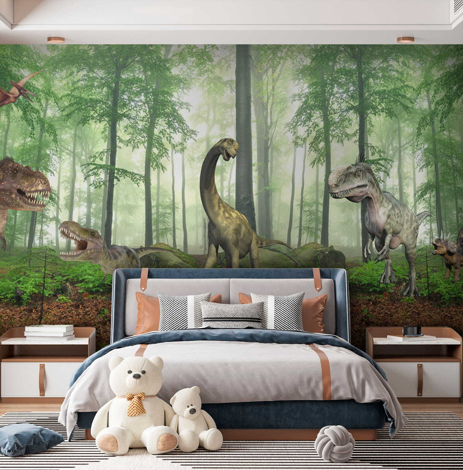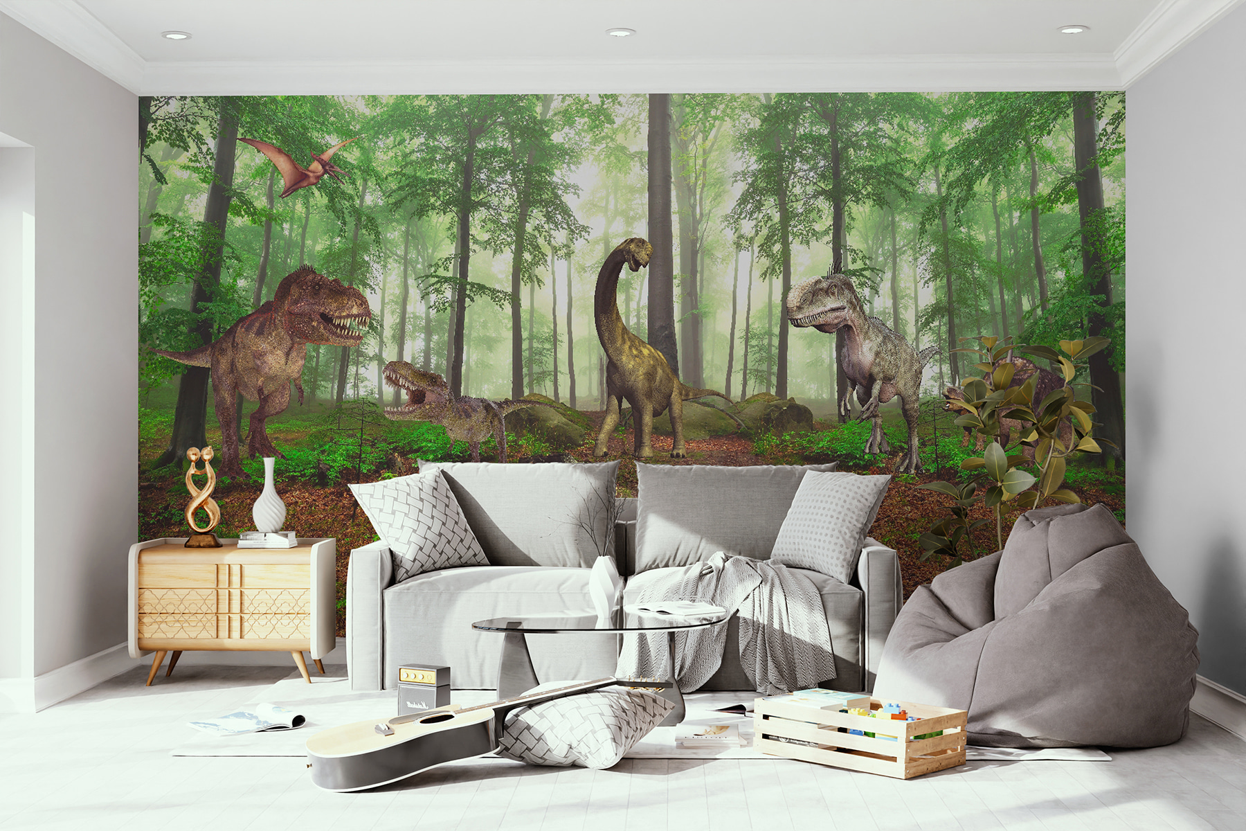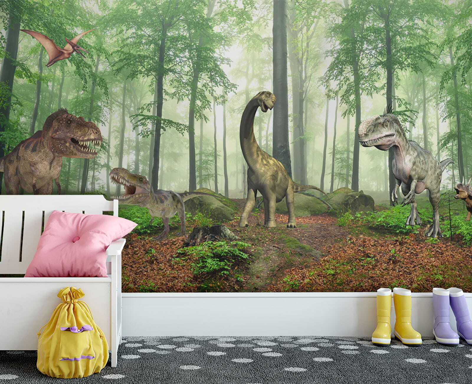 Entrate nel mondo preistorico con questo splendido murale “Dinosauri nel bosco”. Immaginate di trasformare qualsiasi stanza in una vivace foresta giurassica: i bambini si sentiranno dei piccoli esploratori che si muovono tra alberi imponenti e dinosauri amichevoli. È perfetto per stimolare la loro immaginazione e, chissà, potreste anche ritrovarvi a schivare il T-Rex durante la ricreazione! Il verde lussureggiante e i dinosauri dettagliati lo fanno sembrare quasi realistico, portando un po’ di avventura e meraviglia nel quotidiano. Un tocco delizioso per la stanza di ogni bambino, o anche un tocco divertente per gli amanti dell’arredamento più audace. Scrosci di approvazione garantiti!