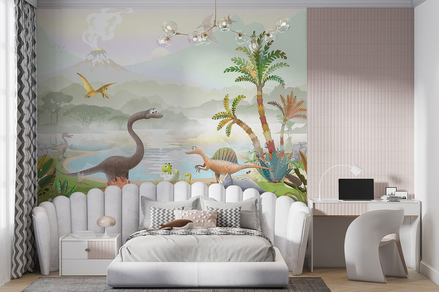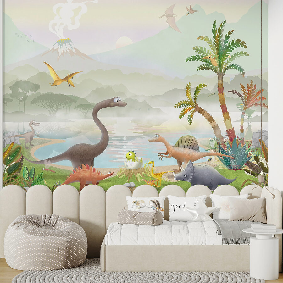Cercate qualcosa che renda la stanza di un bambino entusiasmante? Date un’occhiata a questo adorabile murale con uno pterodattilo che vola alto su un mondo di dinosauri da cartone animato. Immaginatevi i vivaci dinosauri che si aggirano, le rigogliose piante preistoriche e un vulcano fumante sullo sfondo: è come entrare in una coloratissima macchina del tempo! I bambini adoreranno indicare i loro dinosauri preferiti e fingere di volare insieme allo pterodattilo. È perfetto per stimolare l’immaginazione e aggiungere un divertente tocco di colore a qualsiasi stanza. Sarete i genitori più cool dell’isolato!