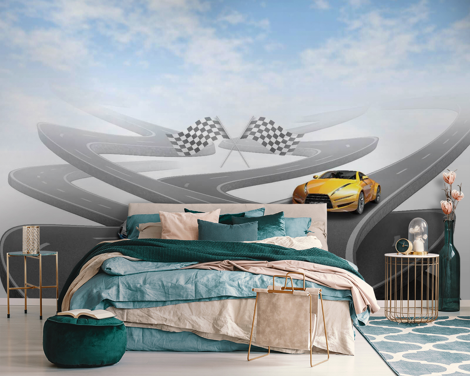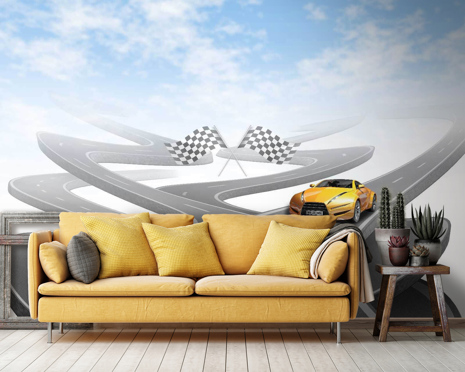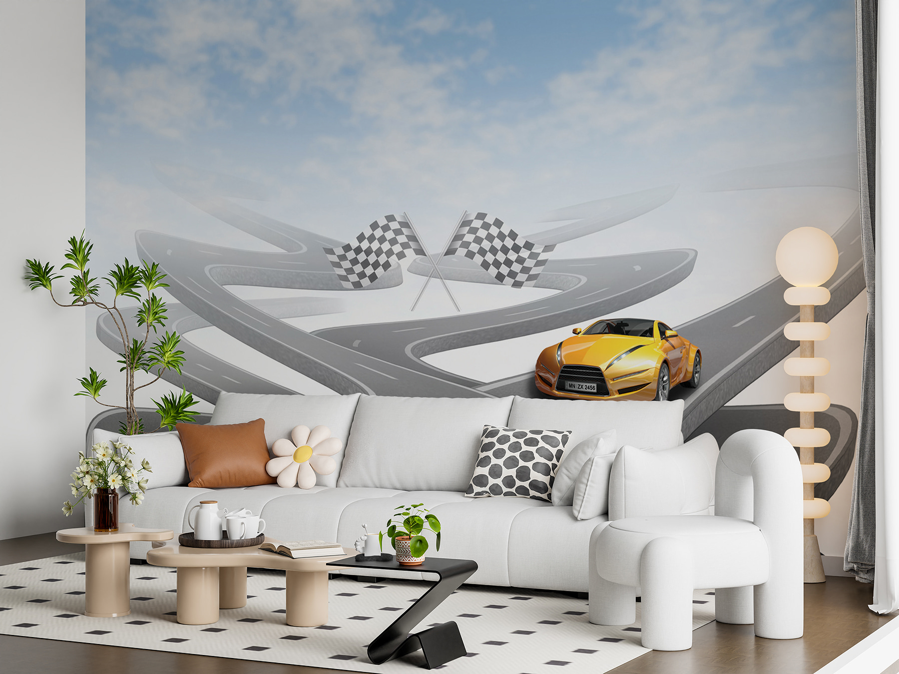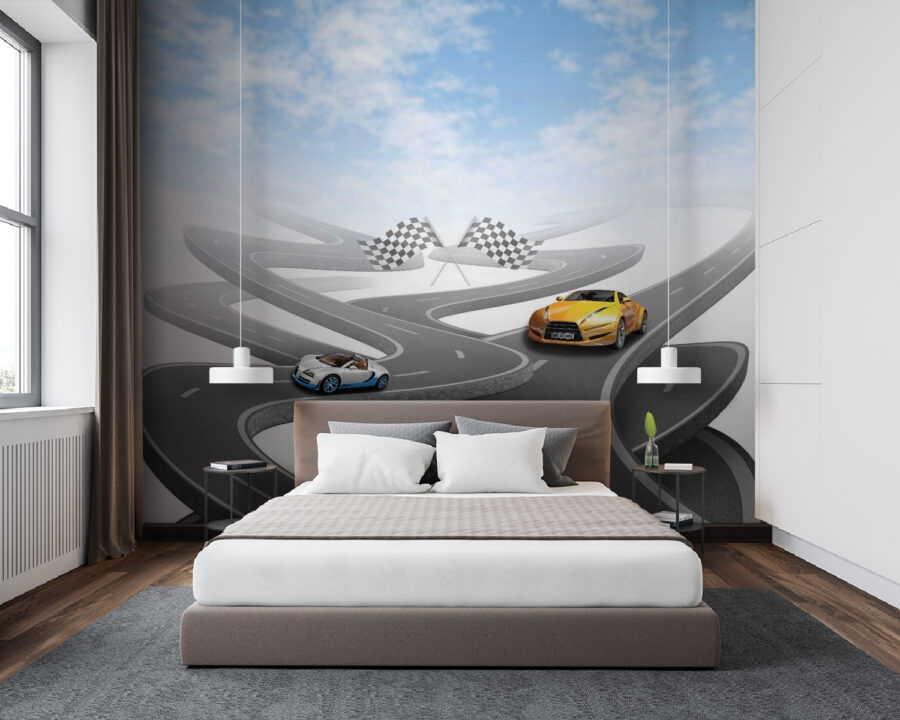 Avete mai sognato di sfrecciare su strade tortuose a bordo di un’appariscente auto sportiva? Questo murales è quello che fa per voi! Con un’auto sportiva di colore giallo brillante su una strada tortuosa e apparentemente infinita, sotto un cielo così blu che potrebbe far prendere vita alle vostre pareti. Perfetto per gli appassionati di auto, per i bambini che sognano avventure da corsa o per tutti coloro che amano un pizzico di eccitazione nell’arredamento. Immaginate le storie che potreste raccontare, come una corsa tra le montagne o una crociera sulle autostrade costiere con il vento tra i capelli. È come una mini-fuga, proprio sulla vostra parete!