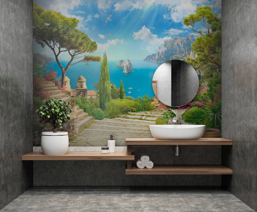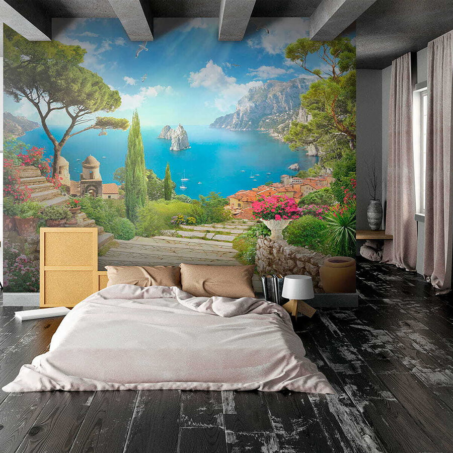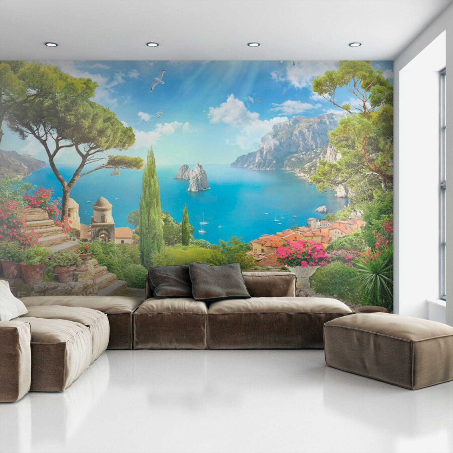 Immaginate di entrare nel vostro salotto, ma al suo posto vi accoglie una splendida vista sul mare. Con “Carta da parati Bird Flying in the Sky”, le vostre pareti diventano più luminose. È come aggiungere una finestra con vista sul Mediterraneo, con un tocco di fantasia. Pensate a una vegetazione vivace, a suggestivi sentieri di pietra e a uccelli che si librano in volo.